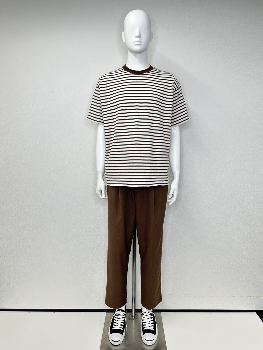ブラウンベースのボーダー柄は、カジュアルな中にも落ち着いた大人の雰囲気を演出し、親しみやすい好印象に繋がります。定番のボーダー柄に遊び心を感じさせつつ、ボトムスと色をリンクさせた統一感が、センスの良さを感じさせるワントーンスタイルです。