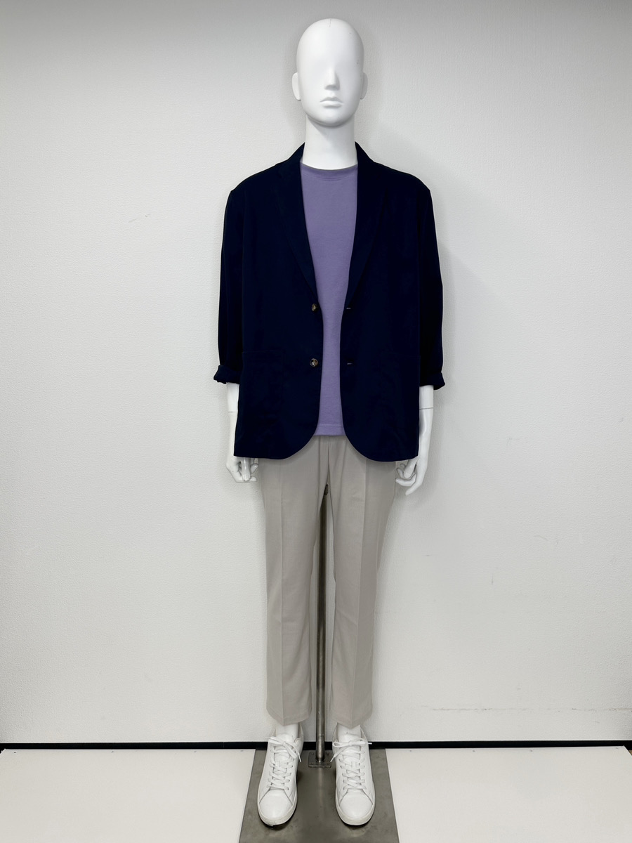 そこで今回は、Tシャツにテーラードジャケットを合わせた「きれいめカジュアル」と、リラックス感のあるTシャツにイージーパンツを合わせた「カジュアルめ」の、2つのオフィススタイルをご紹介します。