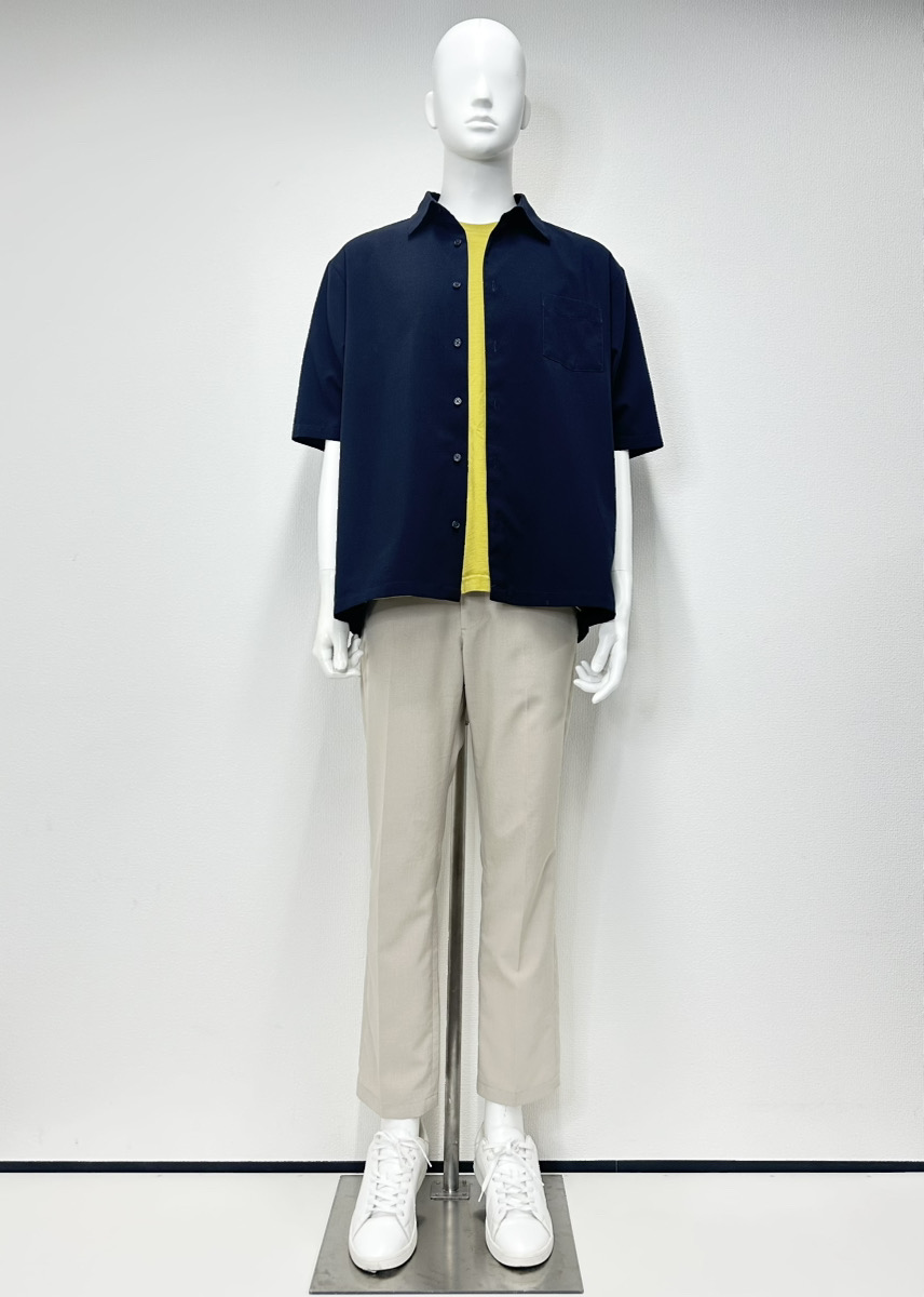 今回おすすめなのが、ネイビーのシャツに、イエローのインナーの合わせ。