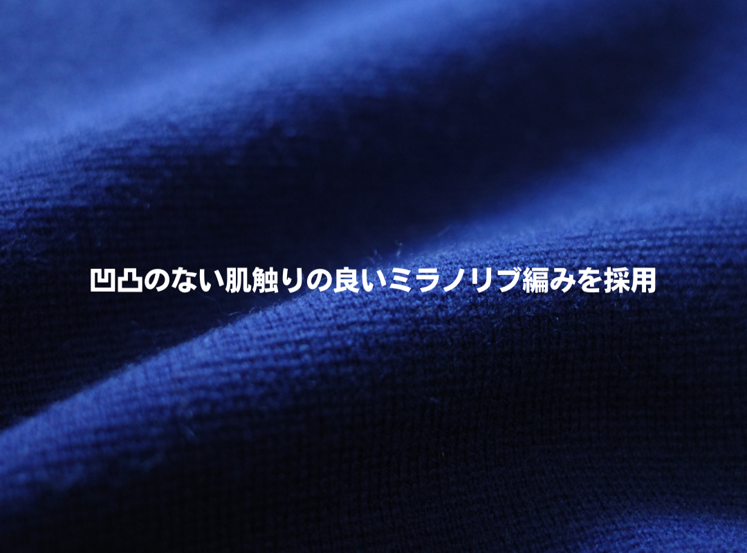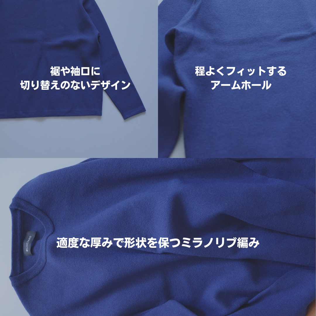 このニットは「ミラノリブ」という編み方で作られており、やや厚手で適度な重みがあり、伸びやヨレが少ないのが特徴です。全体を統一したリブ編みにすることで、凹凸のないシンプルで上品なデザインに仕上げたのでカジュアルにもきれいめスタイルにも着こなすことができます。