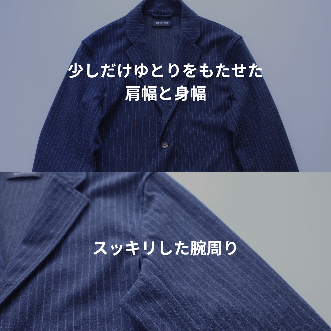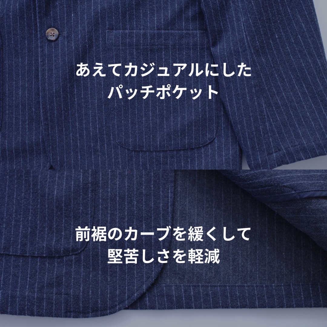 そこで、ゆとりのあるシルエットで堅苦しさを軽減し、程よくカジュアルに着れる素材やデザインを施したジャケットを作りました。