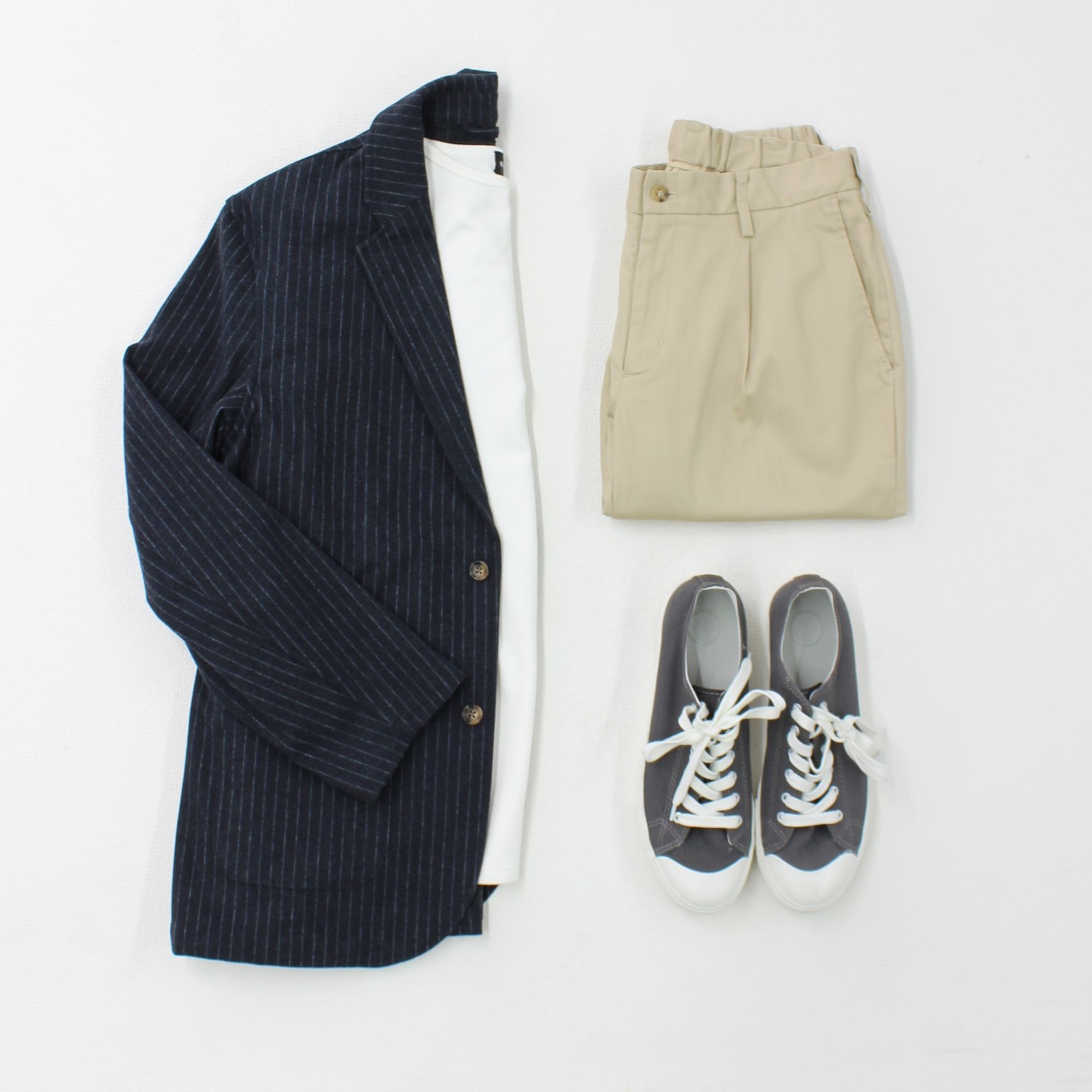 カフェの雰囲気に合うように、ネイビーのジャケットにチノパンとカットソーを合わせたカジュアルなジャケパンコーデにしました。ジャケットが程よくきれいさをプラスし、白のインナーで軽さもある爽やかな印象です。靴はスニーカーにしてよりカジュアルな雰囲気にしましょう。