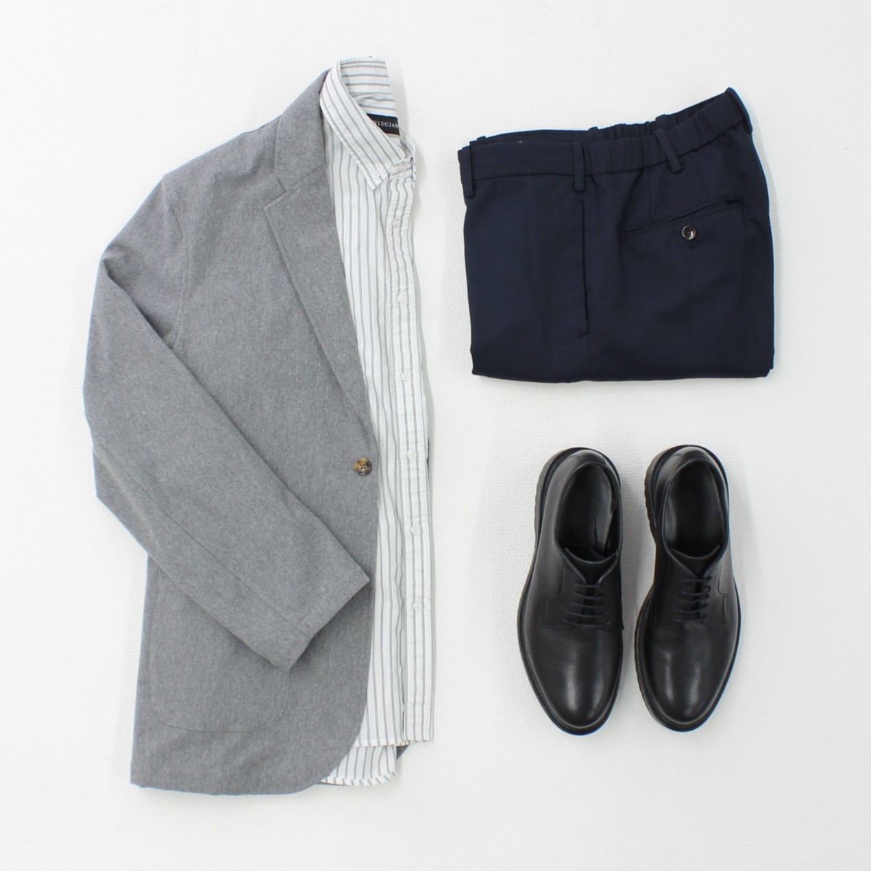 シャツスラックスにジャケットを合わせた定番のジャケパンコーデです。堅苦しくないように、シャツはストライプ柄でシンプル過ぎないポイントを取り入れて、親しみやすさを出しました。職場で馴染むように色はベーシックカラーでまとめるのがおすすめです!