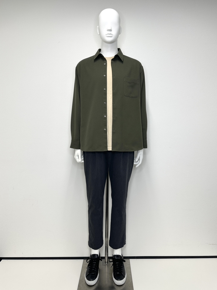 紹介したコーデでは「カーキシャツ×チャコールグレーのパンツ」に、「インナーにライトベージュのカットソー」を入れて明るさを足し、柔らかい印象にしています。