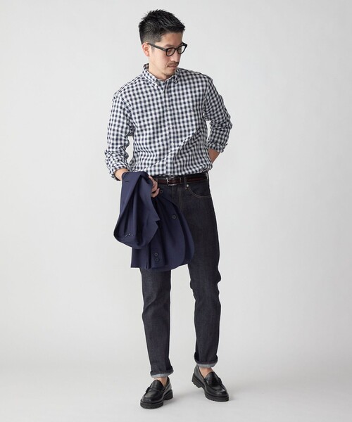 チェックシャツに細身のデニムを合わせて、全体をベーシックカラーでまとめた落ち着いた印象のコーデです。