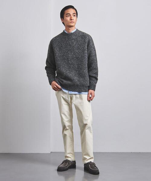 襟と裾からシャツを少しだけ見せることで、コーデにアクセントが効き、メリハリのあるコーデになります。インナーにシャツを合わせると、上品さがプラスされるので、ゆったりとしたニットと相まってラフに着こなすことができます!