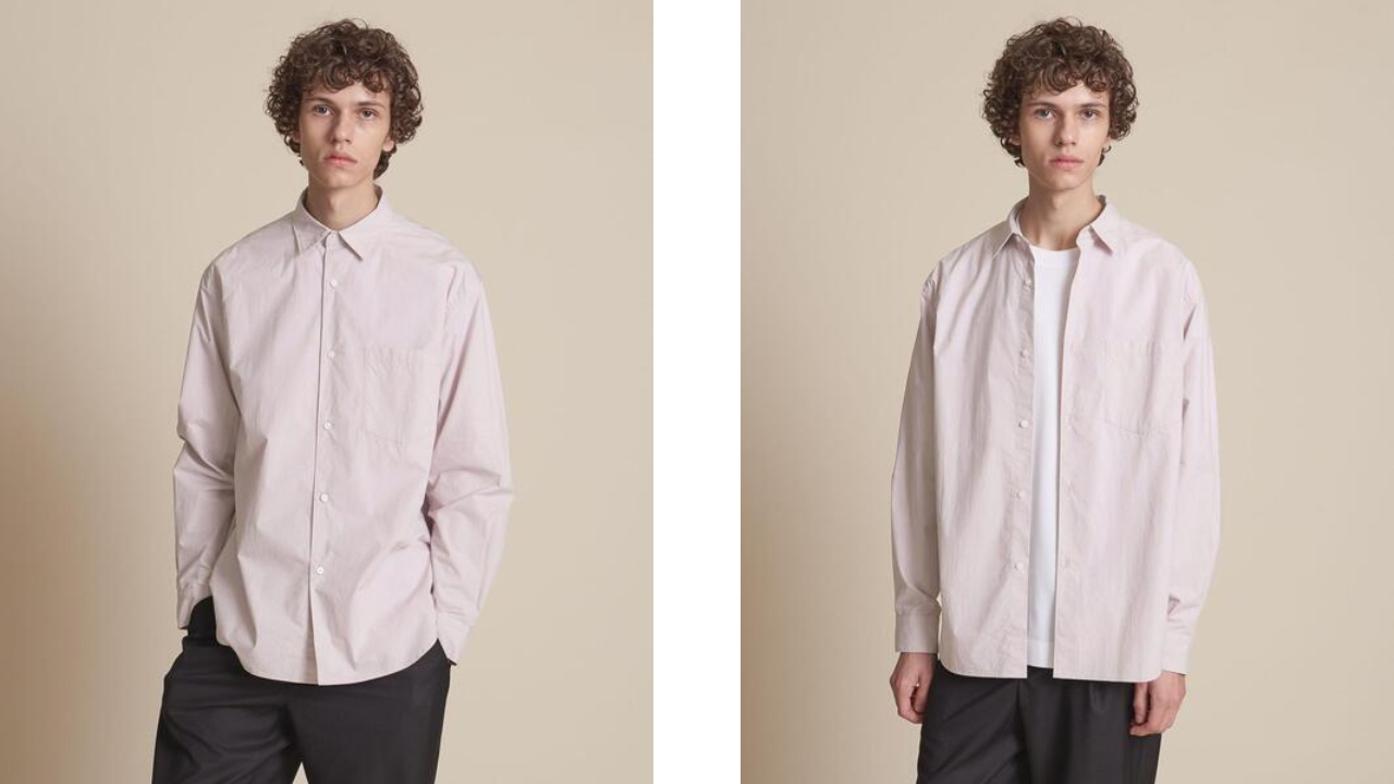 そういったときには、右画像のようにインナーにクルーネックのカットソーをあわせて、シャツを羽織りにすると、あれよあれよとカジュアルな要素が加わって、シャツのきれいめな要素は残しながらもカチッとしたところが和らいだ、ラフなコーデになります。