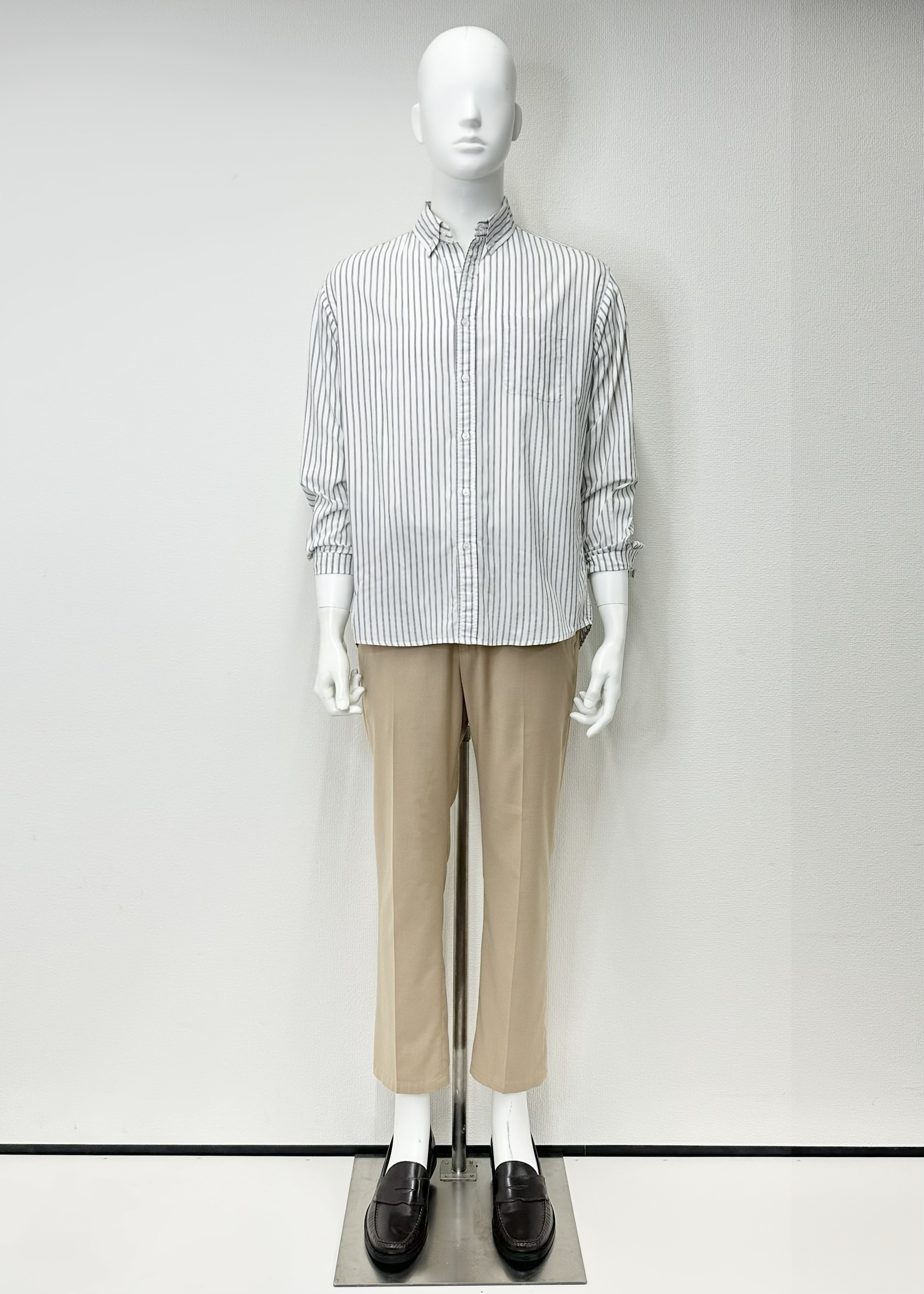 明るめのシャツとのコントラストで、上半身がすっきり見え、バランスの良いコーデに仕上がります。