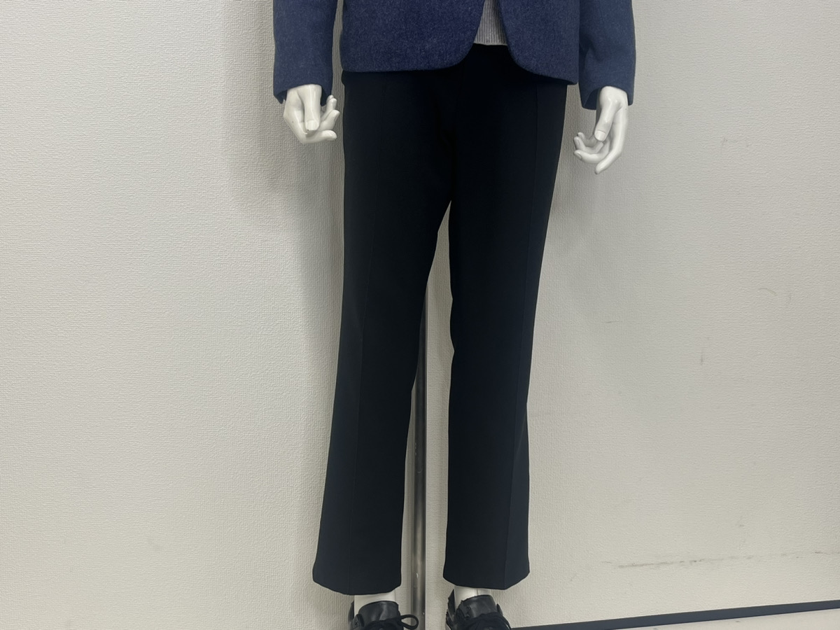 スラックスのほのかなツヤが、上半身のマットな質感とほどよいコントラストを生み、バランスよく整えているのが写真からもわかります。