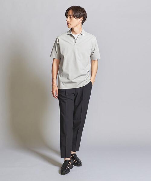 スキッパーポロシャツに白Tシャツをあわせた大人コーデです。スキッパーポロシャツは、通常のポロシャツと異なり、襟がボタンで閉じられないデザインが特徴です。