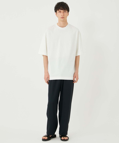一枚で着るTシャツは身体のラインに沿ったやや肩落ちするゆとりがあるサイズがおすすめです。ゆったりとしたTシャツであることボディラインが強調されすぎないフィット感が、カジュアルながらもきちんと感のある着こなしを演出します。