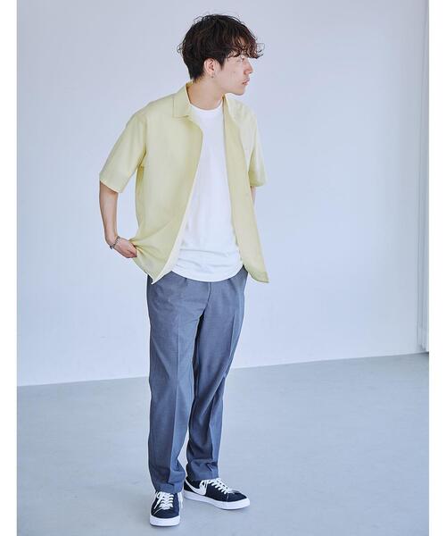 シャツの上からTシャツを重ねるスタイルです。Tシャツはシャツの下から見えるだけで、シンプルながらも動きのあるスタイリングになります。ややゆったりめで透けない薄手のTシャツを合わせると、シャツと相まってきれいめな印象に仕上がります。シャツのボタンを閉じてきちんと感を出すこともできますし、ボタンを開けて抜け感を出すこともできます。