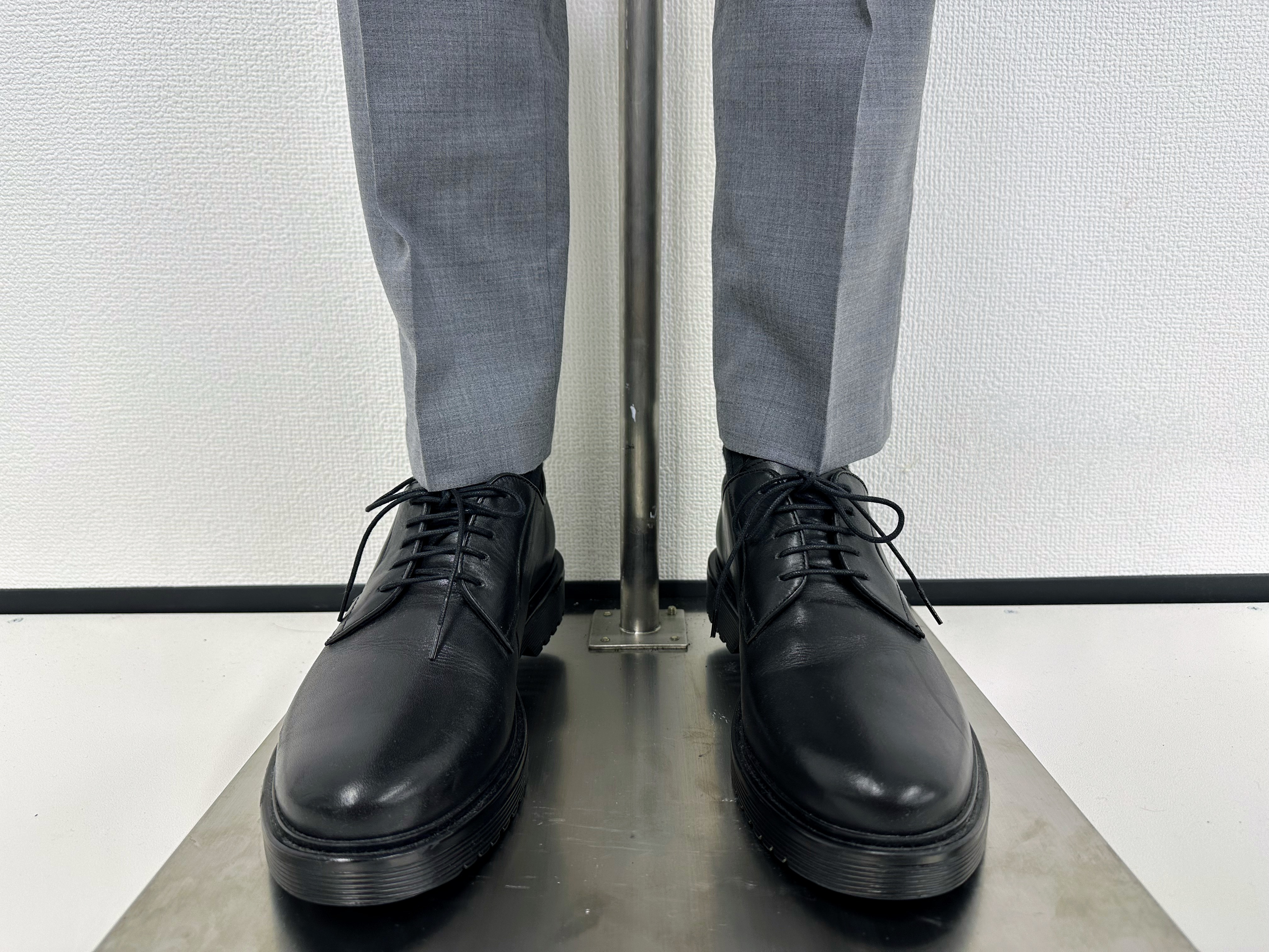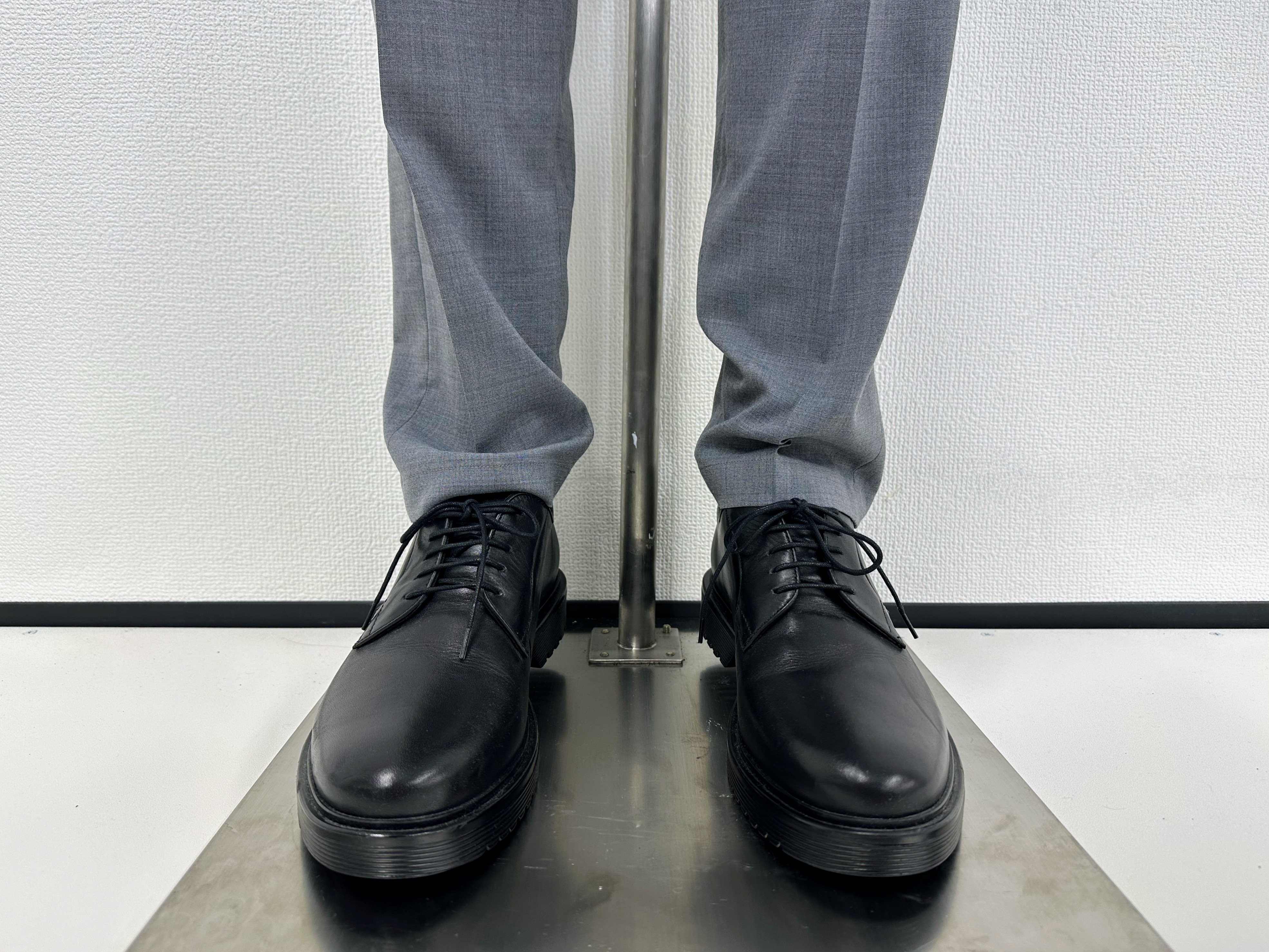 正しい丈感:裾が靴の甲に軽く乗るくらいで、もたつきのない長さ。