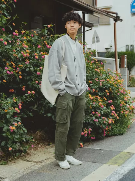 写真のようにカーキのパンツやグレーのカーディガンのくすんだ色合いでも、白のスニーカーが抜け感をだしているので、地味にならず全体を爽やかな雰囲気にしています。