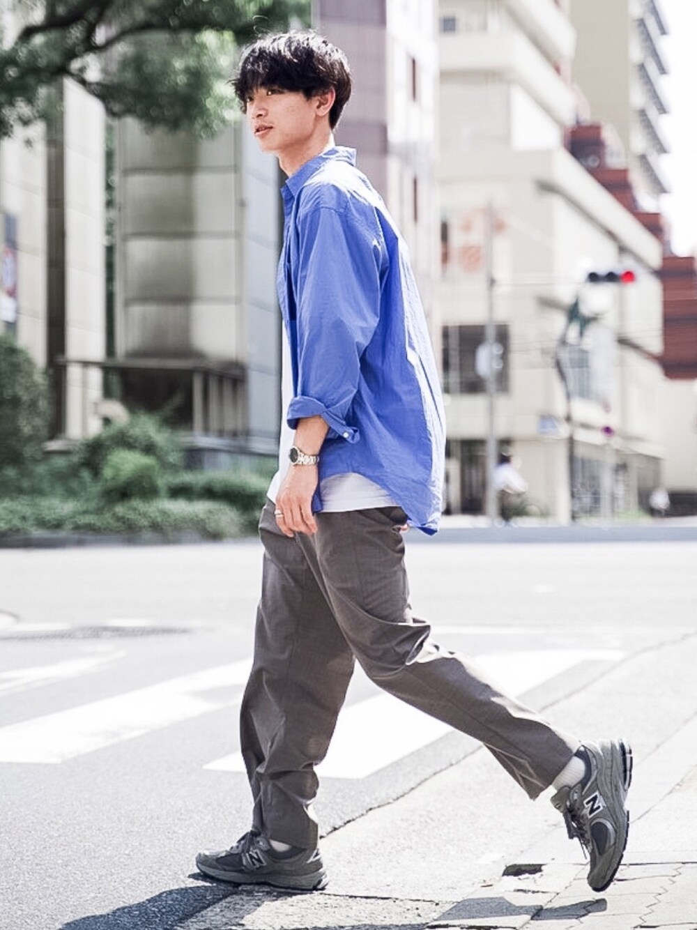 主張の少ないグレーが、トップスの色を引き立てる効果があります。写真のようにブルーのシャツを合わせるだけで主役がはっきりしたシンプルなコーデを作ることができるんです。