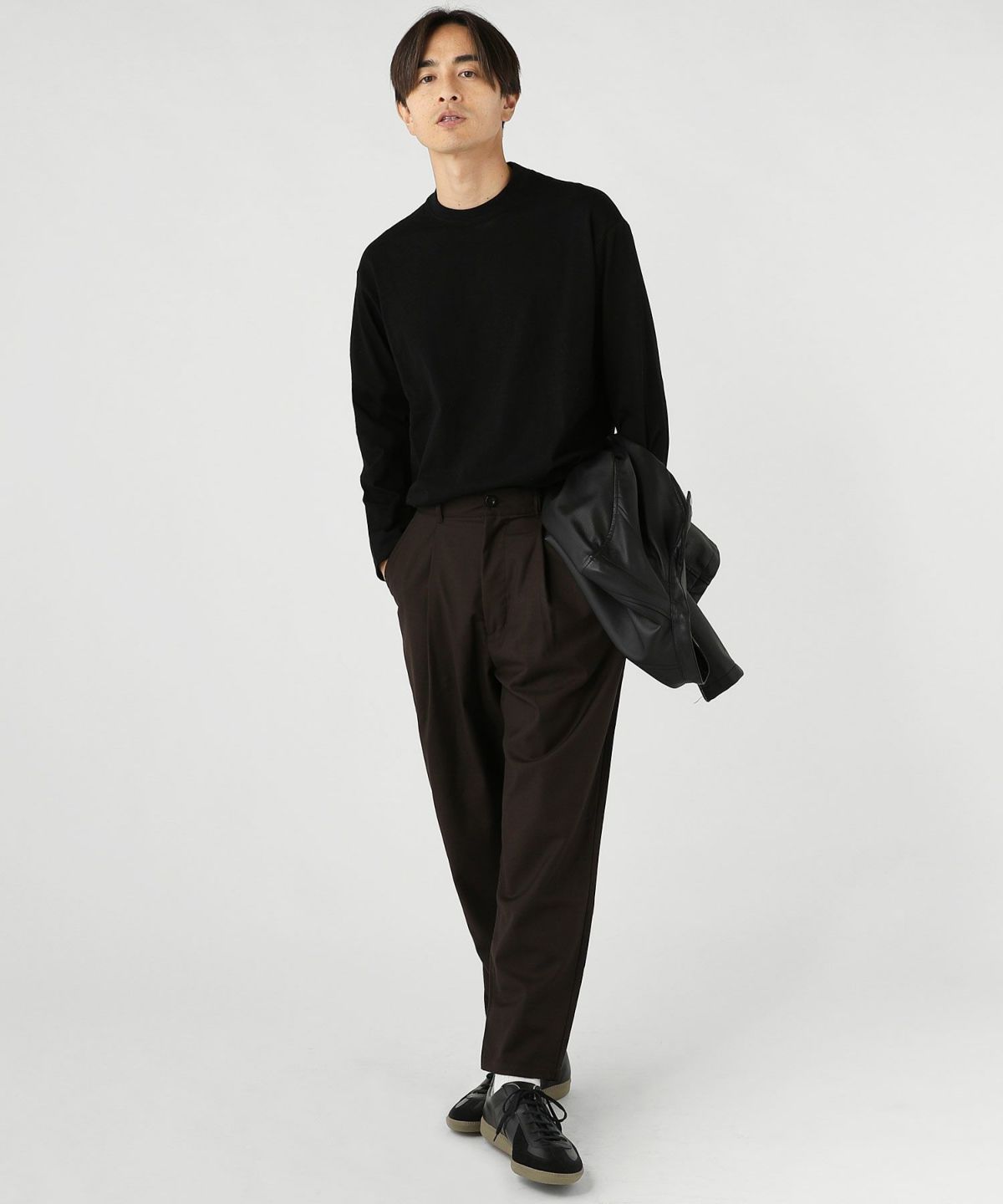 暗い色のパンツと合わせると靴との境目が目立たなくなるので、足が長く見え、さらにスタイルアップして見える着こなしになります。