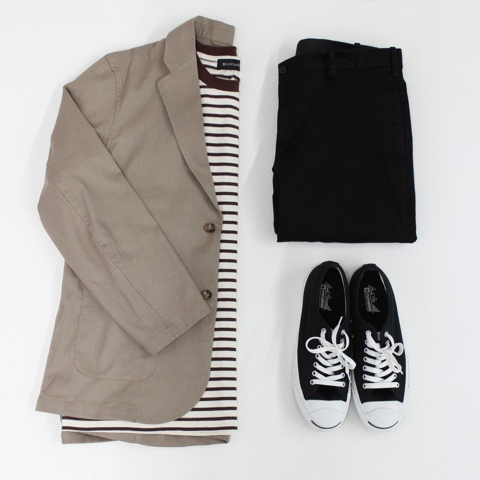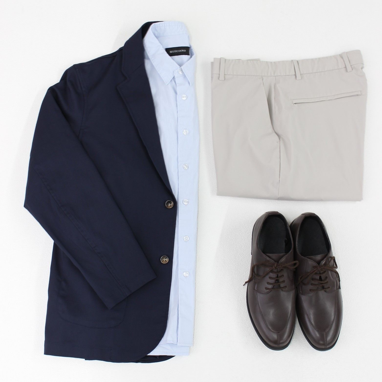 ビジネスシーンの打ち合わせや、きれいめな場所で人と会うシーンにぴったりな、きちんと感を意識したスタイリングをしました。シャツとジャケットはブルー系で統一し、ボトムスは明るめのライトグレーのスラックスを合わせて、清潔感と爽やかな印象を与えるようにイメージして作っています。