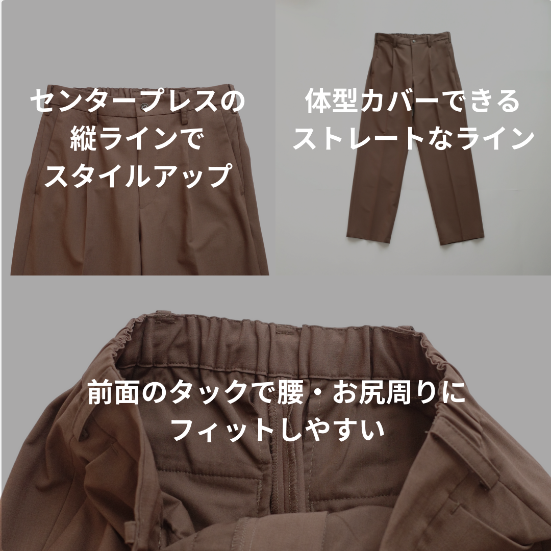 「自分の体型に合うボトムスがわからない」というお悩みの相談を何度かいただくことがありました。 お尻や太もも周りがきつくないか気になったり、足が短く見えたりしてしまうなど、「本当に自分の体型にあっているのかな?これで良いのかな?」と不安に感じることがあると思います。そこで、今回は「どんな体型でもきれいに着こなせるスラックス」を開発しました。 このスラックスは、どんな体型でも美しいシルエットで着こなすことができて、日常のあらゆる場面で活躍します。