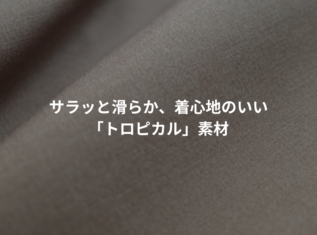 トロピカルという素材はウールを含んでいますが、冬物のウールとは違い糸が細く、目の粗い平織りで風通しが良く、涼しい着心地です。 肌触りがサラッとした滑らかな感触が特徴で、とても軽く着心地が良いです。 ツヤのある質感で見た目は上品で、伸縮性もあるので動きやすく、とても履きやすいです。