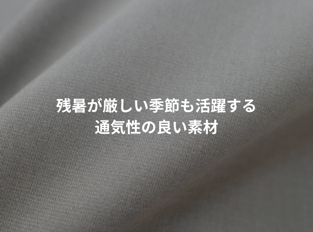 通気性の良いリネンライクの細かい凹凸がある生地です。凹凸により肌に触れる面積が少ないので、サラッとした肌触りで、まだ残暑が厳しい季節も涼しく着れます。