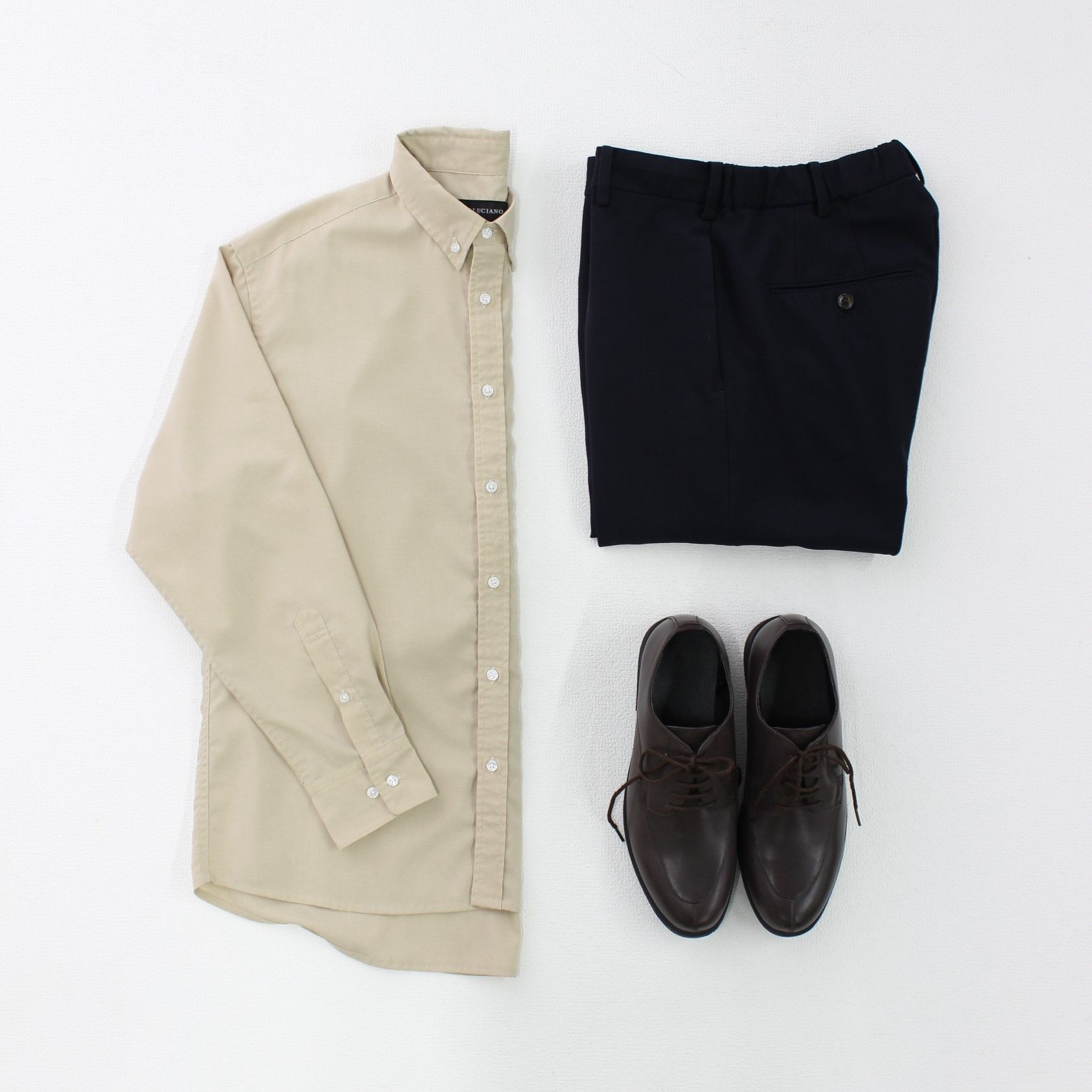 社内や社外の人から好印象に見られる事を意識して、優しい印象のライトベージュのシャツに、ボトムスに暗めの色を合わせて安心感のあるキレイ目カジュアルなコーデにしました。
