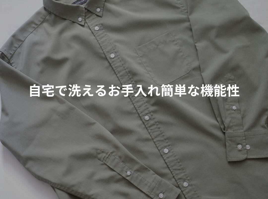 ポリエステル100%素材でしわになりにくく、自宅で洗濯可能でアイロンも不要のイージーケアです。