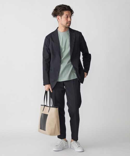 インナーを明るいグリーンにすることで、抜け感のあるカジュアルなジャケパンコーデです。ジャケットとスラックスは落ち着いた色味で合わせて、シンプルで洗練された印象になっています。インナーはコーデ全体に占める面積が少ないため、色味を取り入れても派手さを抑えながら、スタイリングにアクセントを与えることが可能です。シンプルなコーデに遊び心や個性を加えたいときに効果的な組み合わせです。