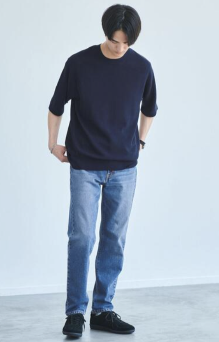 トップスは落ち着いた暗めの色を選ぶことで、全体のメリハリを引き立たせたスタイリッシュな雰囲気を演出しています。ボトムスに明るい色味を選びにくいと感じる場合でも、明るいジーンズならば違和感なく取り入れることができるため、初めて挑戦する方にもおすすめです。明るいブルーが軽快さと爽やかさをプラスしたスタイリングになっています。