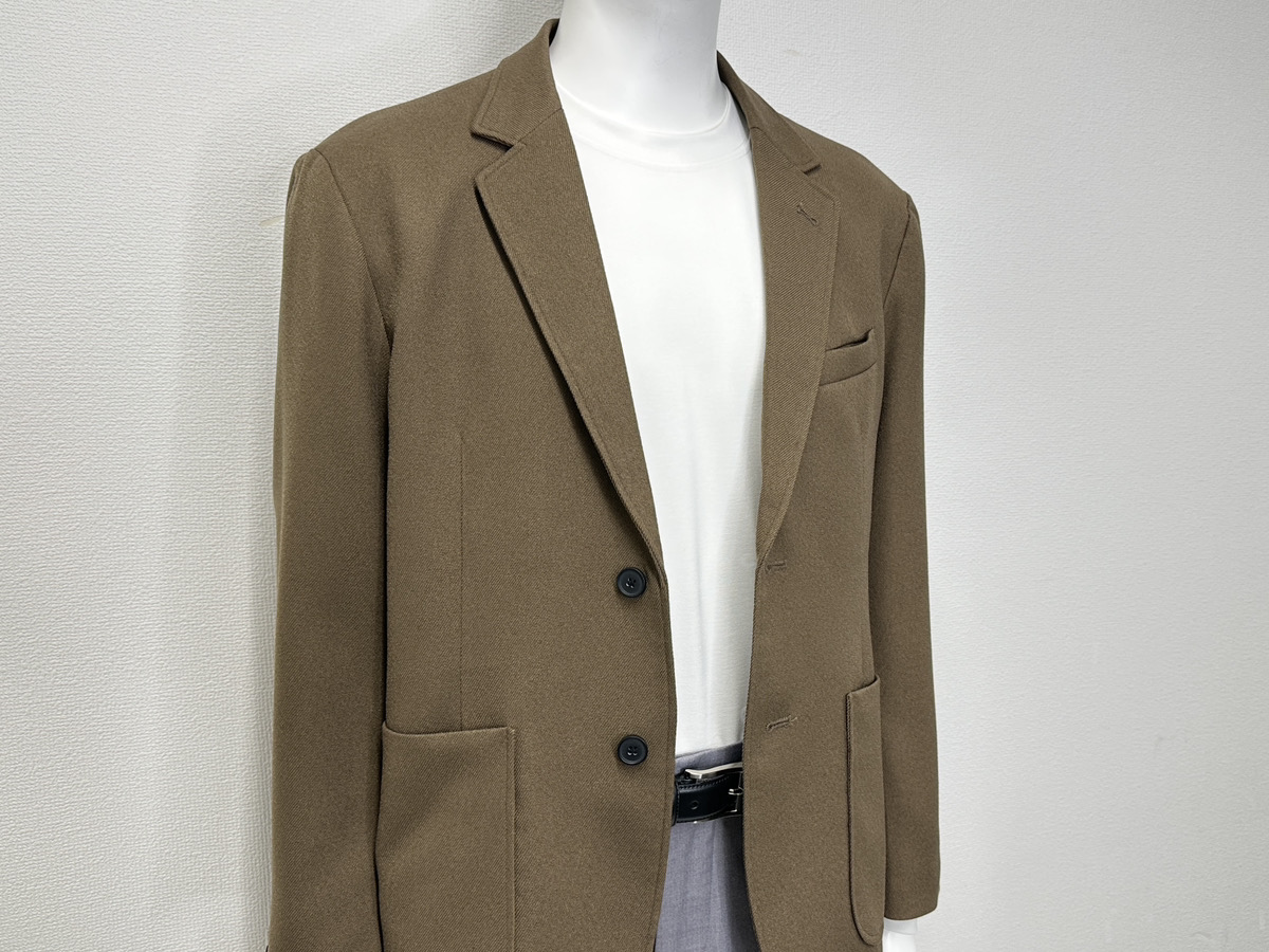 深みのあるブラウンのジャケットは、羽織るだけで暖色特有のぬくもりを感じさせます。相手に緊張感を与えない、優しい雰囲気が魅力です。