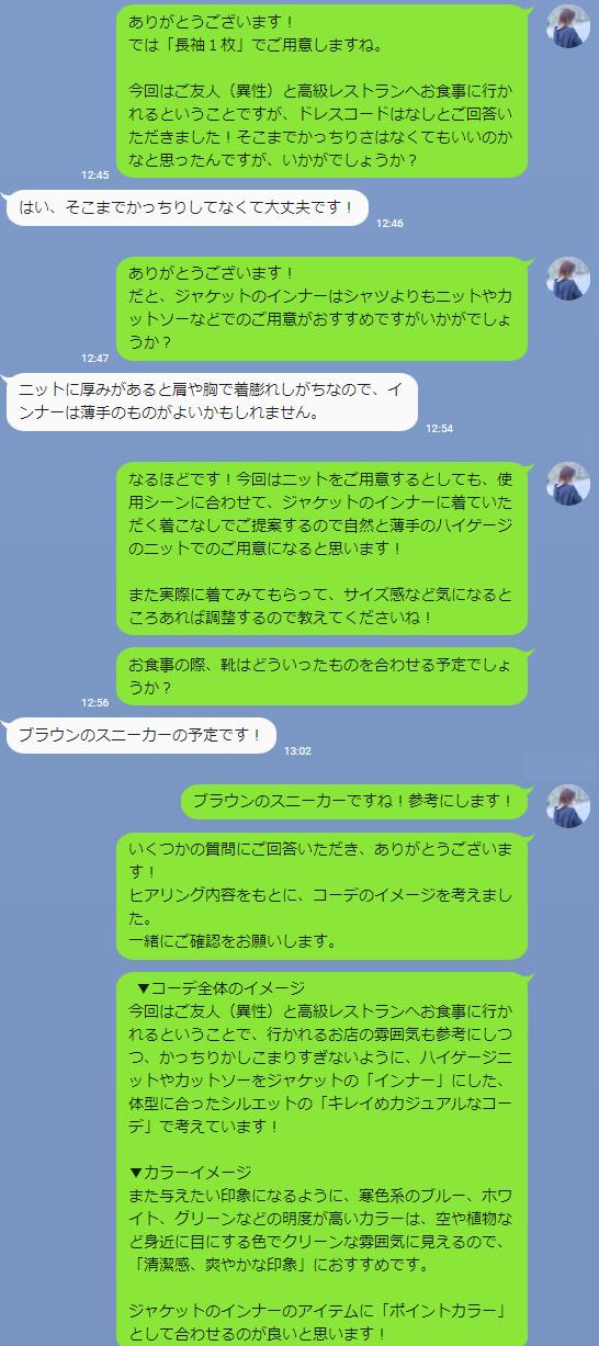 ひとりひとりの希望をよく聞き、それをもとにシーンにあわせてコーデを作り、届いたコーデのレビューをもとに次回のコーデをより良くする。