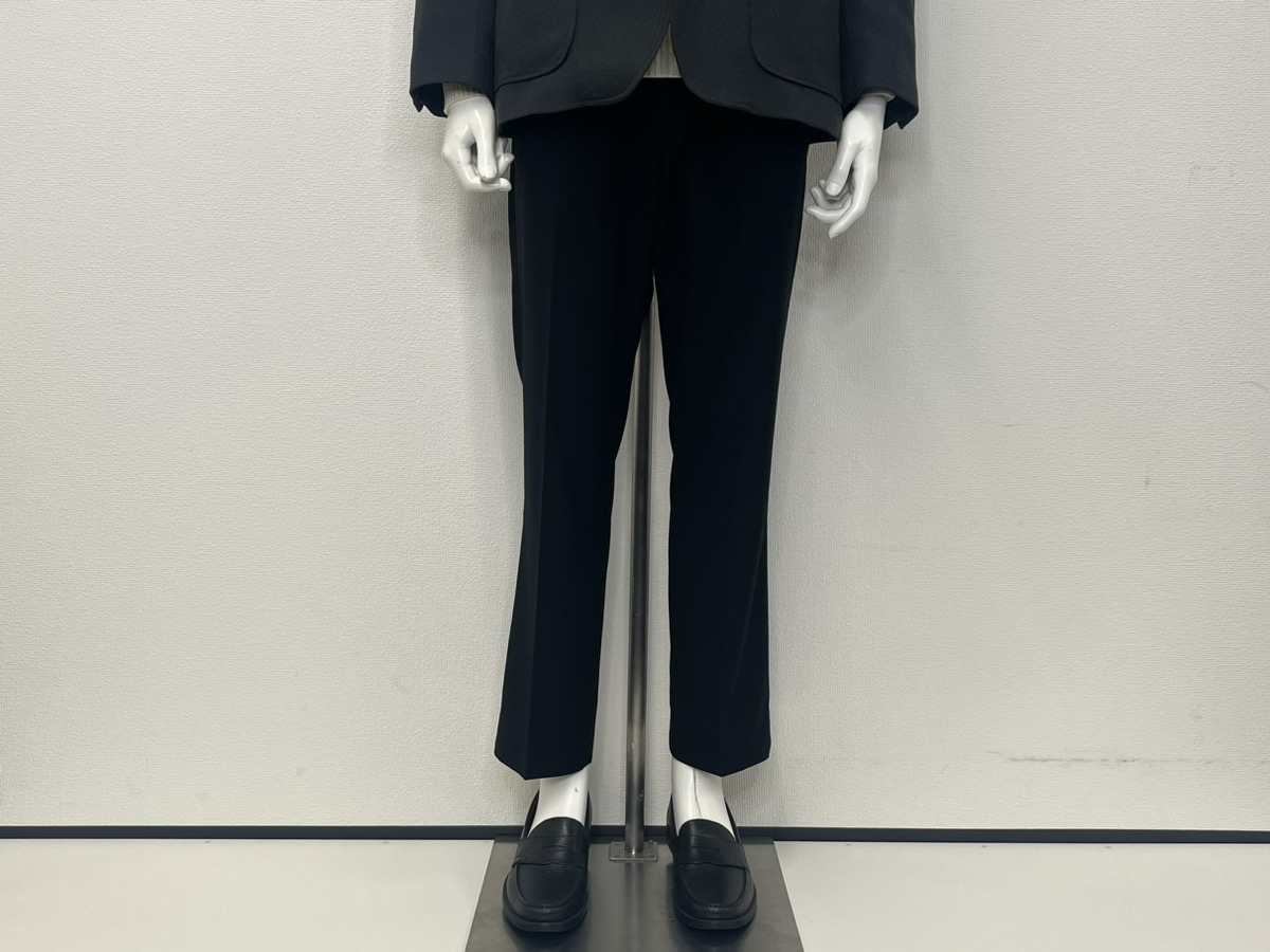 パンツはブラックのセンタープレス入りのスラックスで脚をまっすぐ長く見せつつきちんと感をキープ。足元は黒の革靴で全体を引き締めると、シンプルで洗練された大人の仕事スタイルが完成します。