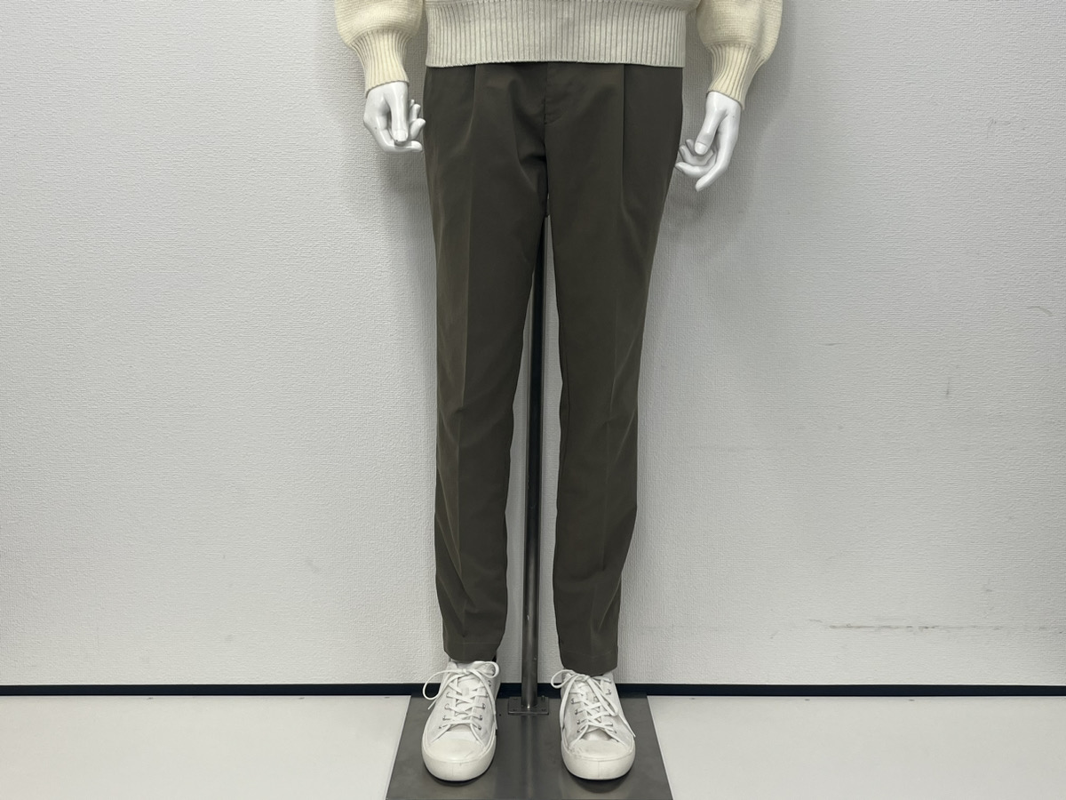 合わせるパンツは、カーキなど落ち着いた色のスラックスを選ぶと、清潔感をキープしつつ大人っぽく親しみやすい印象に。白スニーカーで全体を軽やかにまとめると、休日らしい余裕感も演出できます。