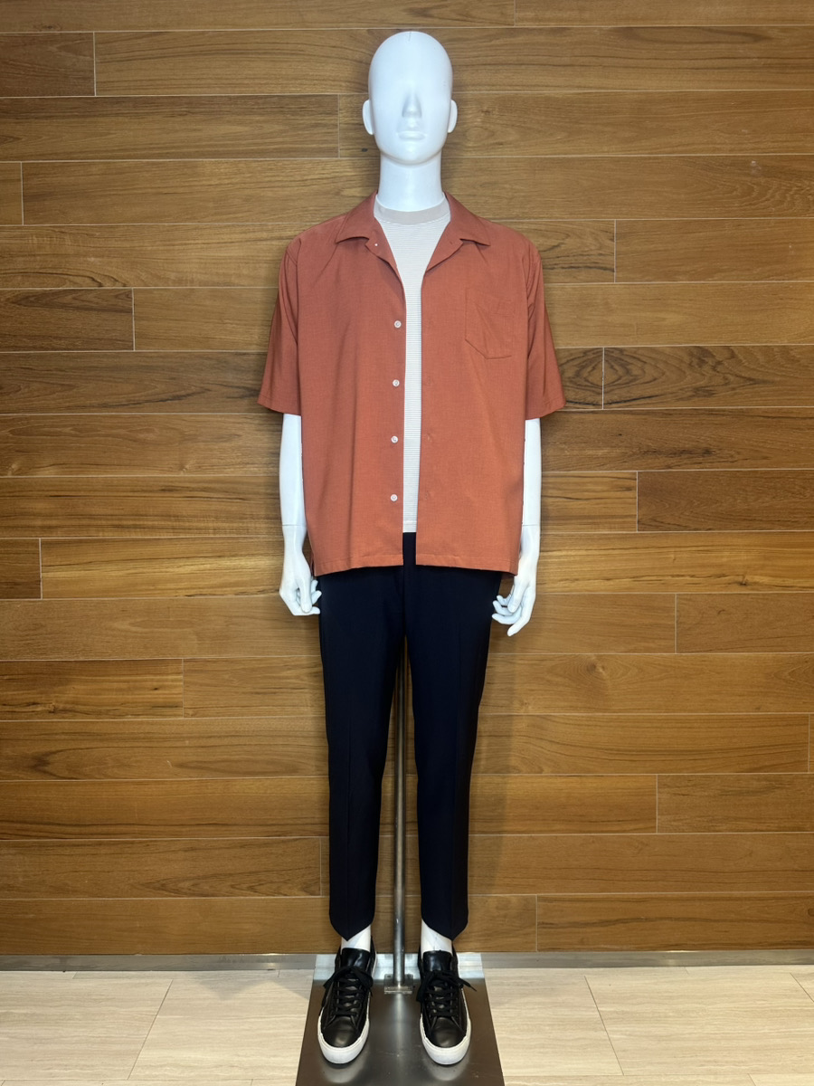 まず取り入れてみてほしいのが、オレンジのオープンカラーシャツ。