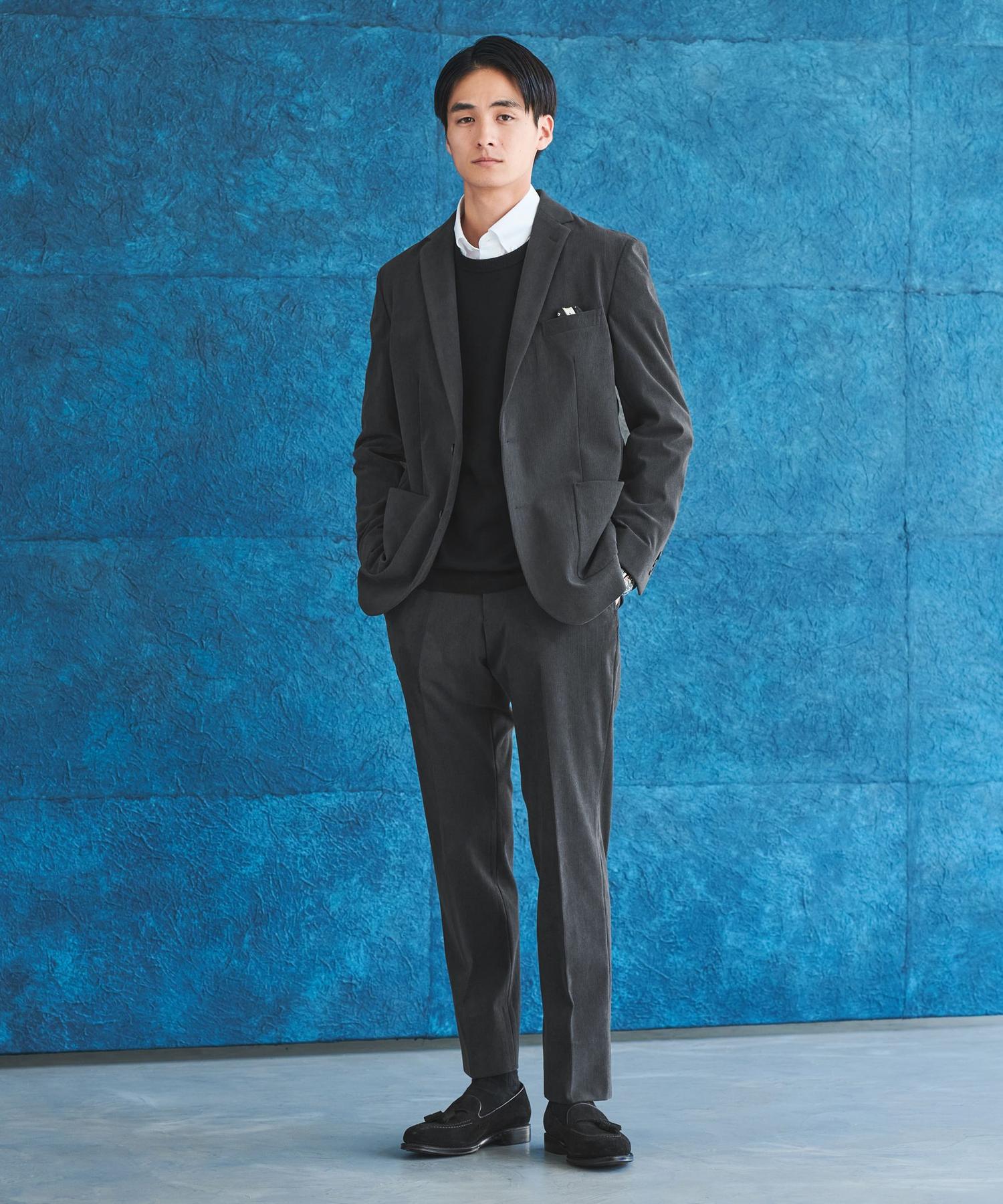 セットアップのジャケットのインナーに、白シャツとハイゲージニットを重ね着した、キレイめなジャケットスタイルのコーデです。