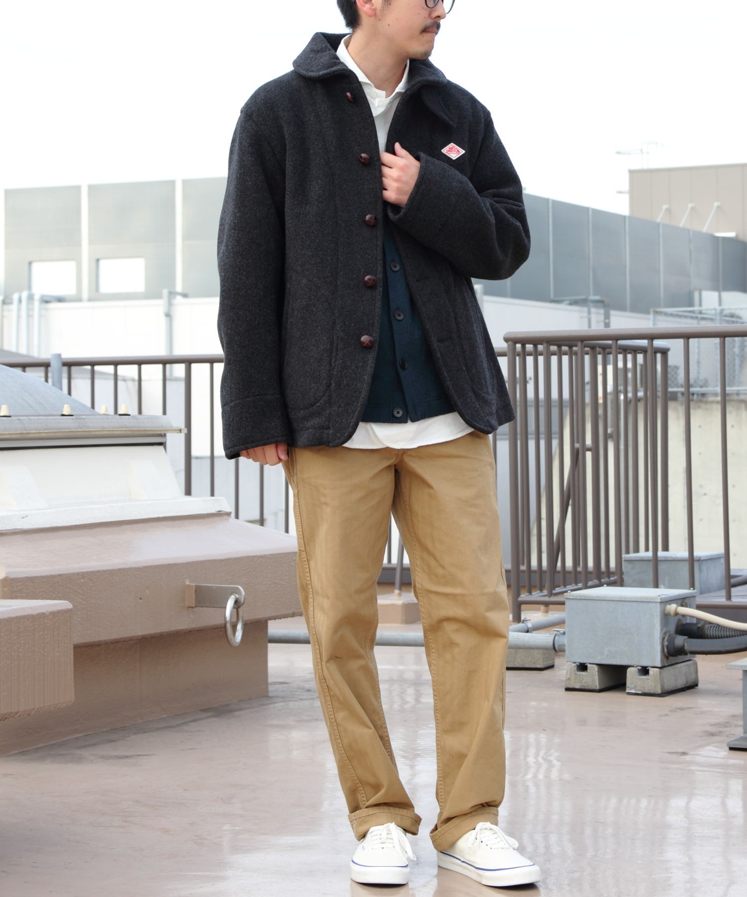 ボリュームのあるカジュアルなアウターに、シャツとニットを重ね着することで暖かさをプラスした、冬のお出かけにピッタリなコーデです。