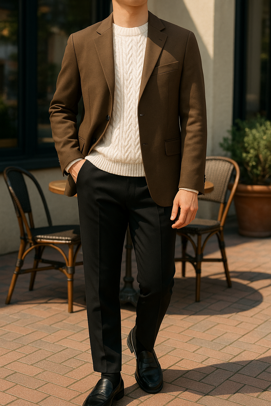 ブラウンとオフホワイトの柔らかさで話しやすい雰囲気が作れるし、黒パンツのおかげでちゃんとしてる感もほどよく出ます。