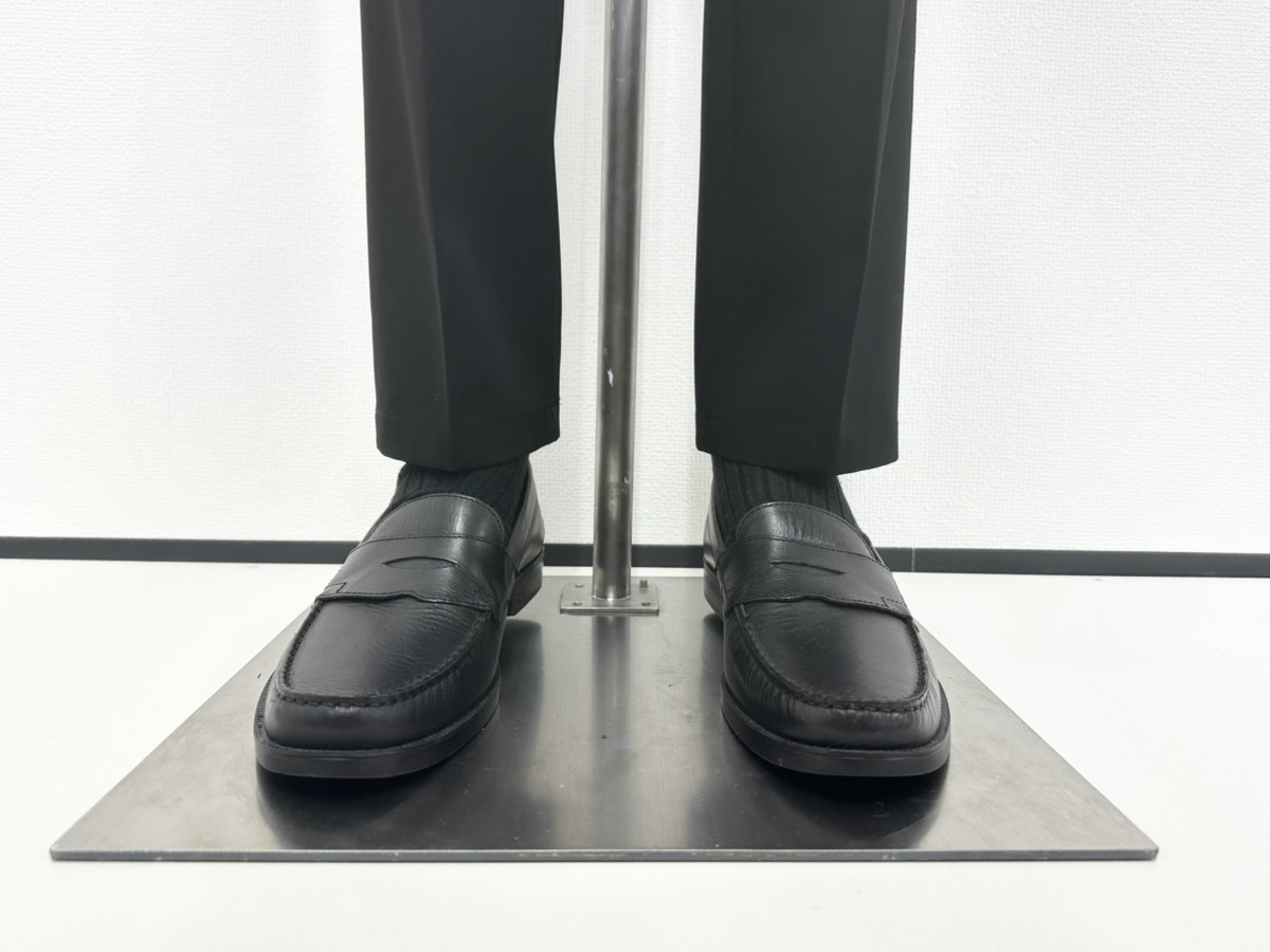 このような丈感は「ノークッション」または「ワンクッション未満」と呼ばれ、誰でも脚がすっきり見えやすく、清潔感のある印象を作れます。