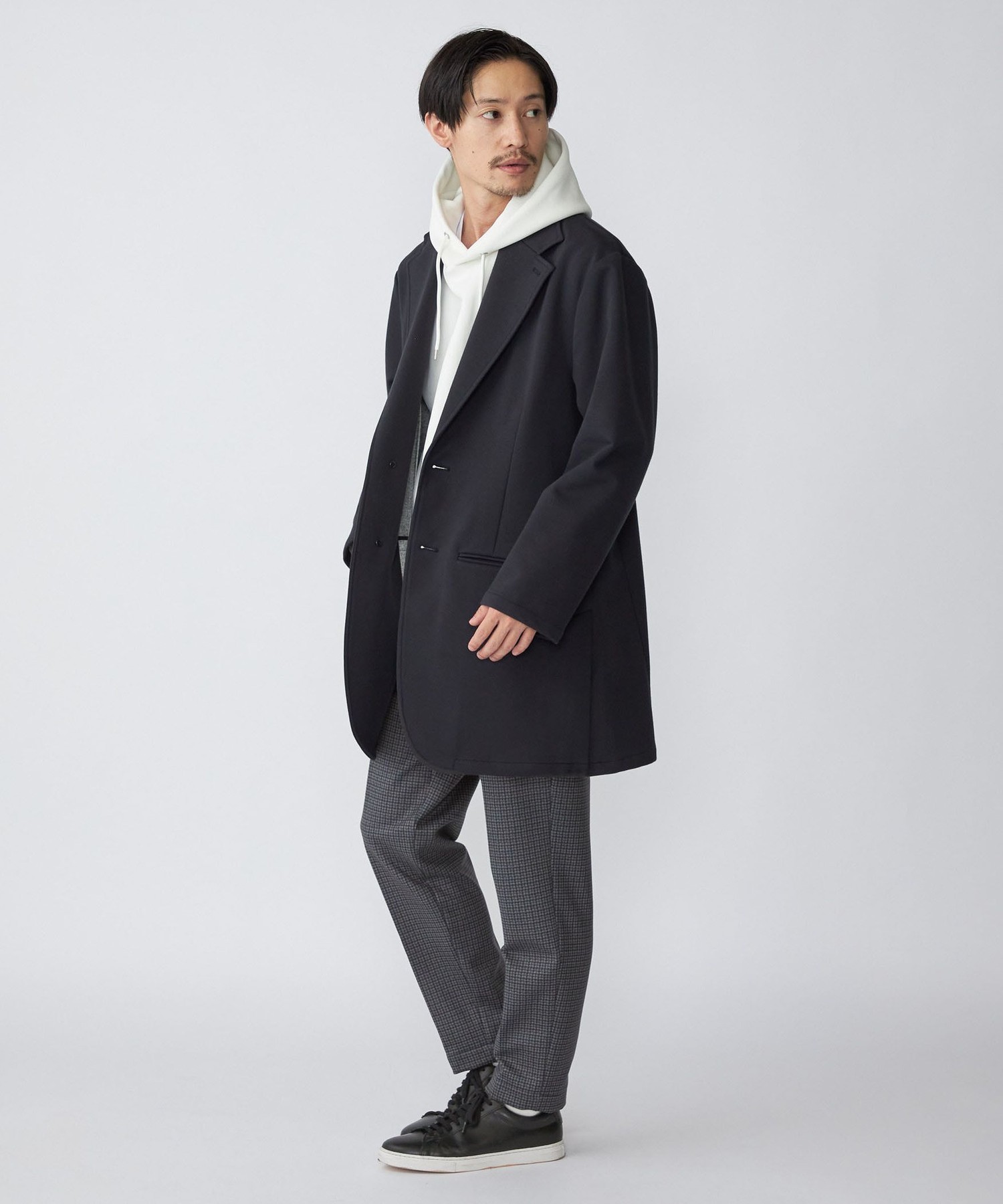 チェスターコートとスラックスのキレイめな組み合わせに、インナーにスウェット素材のパーカーを合わせることで少しカジュアルダウンさせた、動きやすさもある過ごしやすいコーデになっています。ベーシックカラーでまとめることで落ち着いた印象になり、ラフになりすぎないので、普段着やカフェのカジュアルなデートなど様々なシーンに合います。
