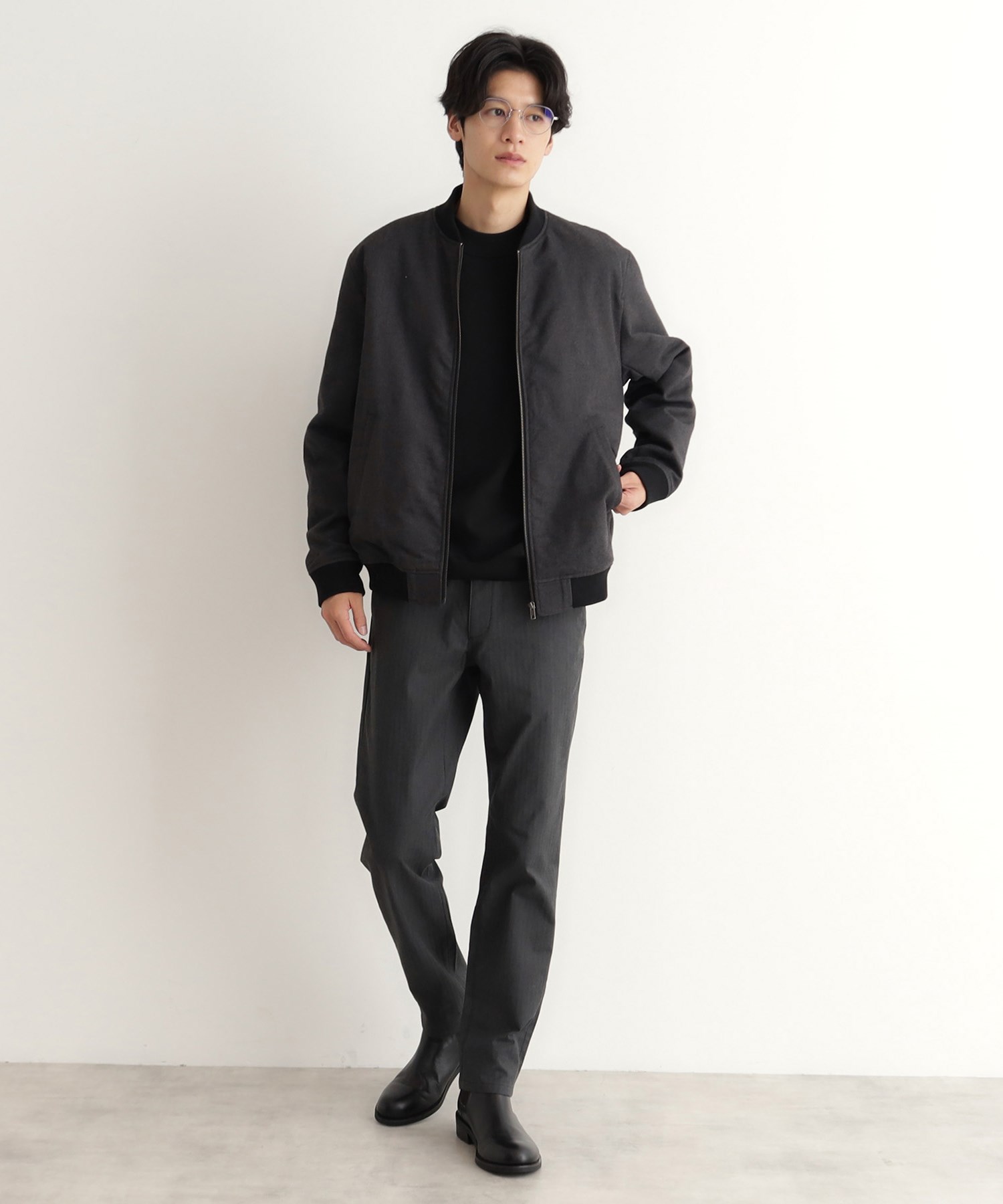 濃淡や質感が異なる黒アイテムを組み合わせているので、自然にメリハリが生まれているのがポイント。また、絶妙なサイジングで全体のシルエットがきれいにまとまっているため、野暮ったさのないスマートな着こなしが完成しています。