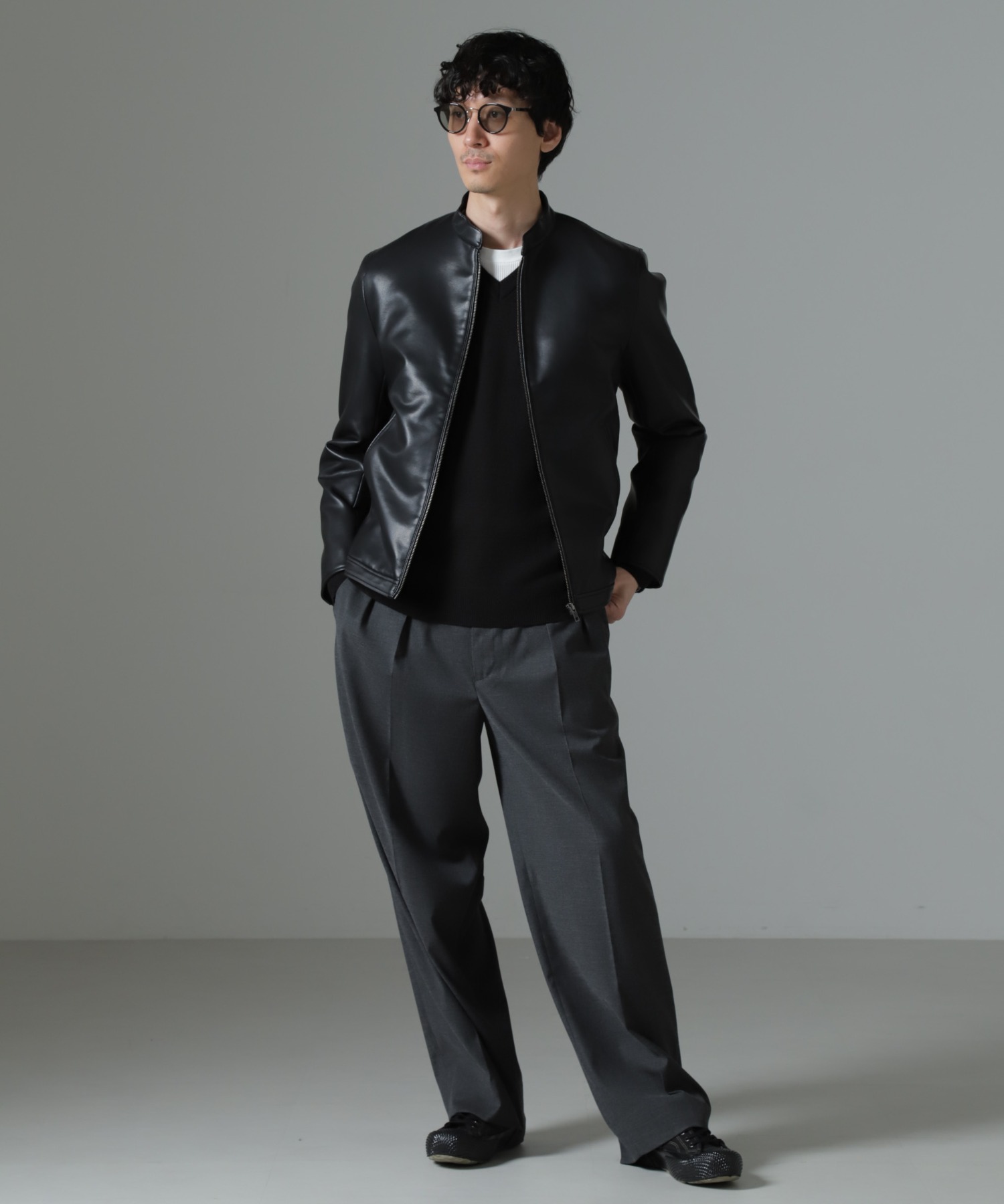 上半身はタイトなラインなので、パンツはやや太めをチョイスしてバランスを整えているのがポイント。センタープレス入りのきれいめパンツできちんと感を残して、スタイリッシュに仕上がっています。ひと味違うブラックコーデを楽しみたい方におすすめの着こなしです。