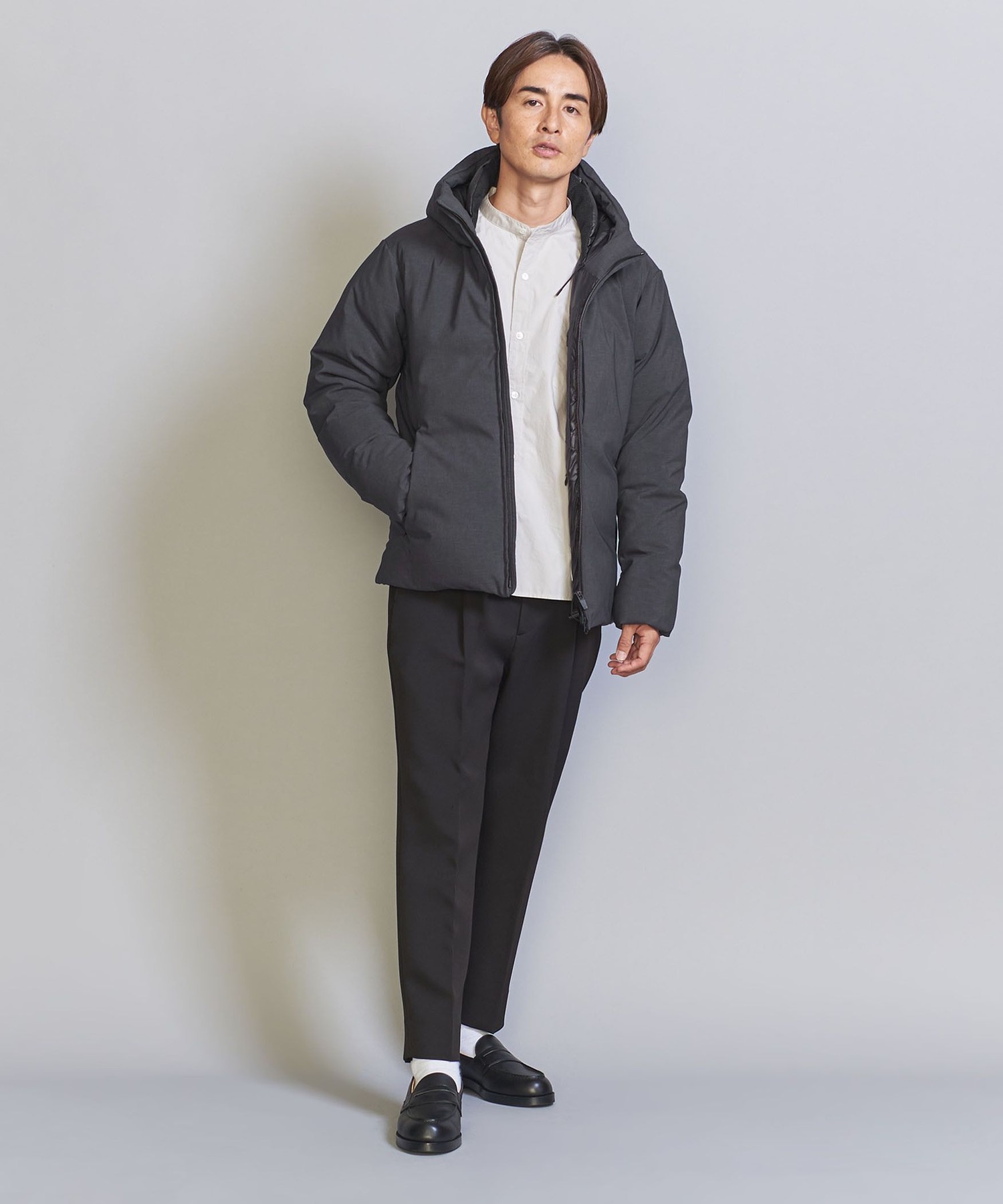 定番ともいえる黒ダウンジャケットは、ボリューム感が出すぎると着膨れしているような印象を与えてしまいます。厚手のインナーは1枚にして物理的な着膨れを予防しながら、細身のパンツで全体のシルエットを整えているのがポイントです。