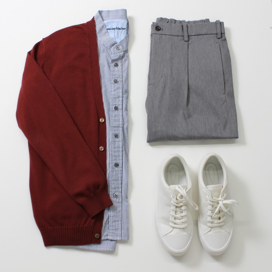 ゆったり過ごせるようにカーディガンを羽織にしたリラックスコーデにしました。エンジ色の暖色をメインにすることで柔らかく、優しい印象に見えます。シャツも襟のないバンドカラーにすることでよりラフさが出て、カジュアルなカフェにぴったりなコーデになります。
