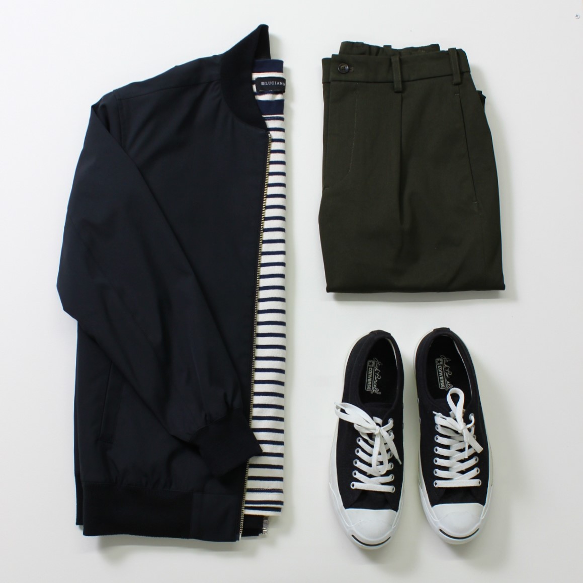 歩きやすいチノパンツにブルゾンを羽織って温度調整もしやすいカジュアルコーデにしています。パンツはカーキのくすんだ色味で季節感を出して、インナーのボーダー柄で爽やかさをプラスすることで重たくならないバランスの取れたコーデです!