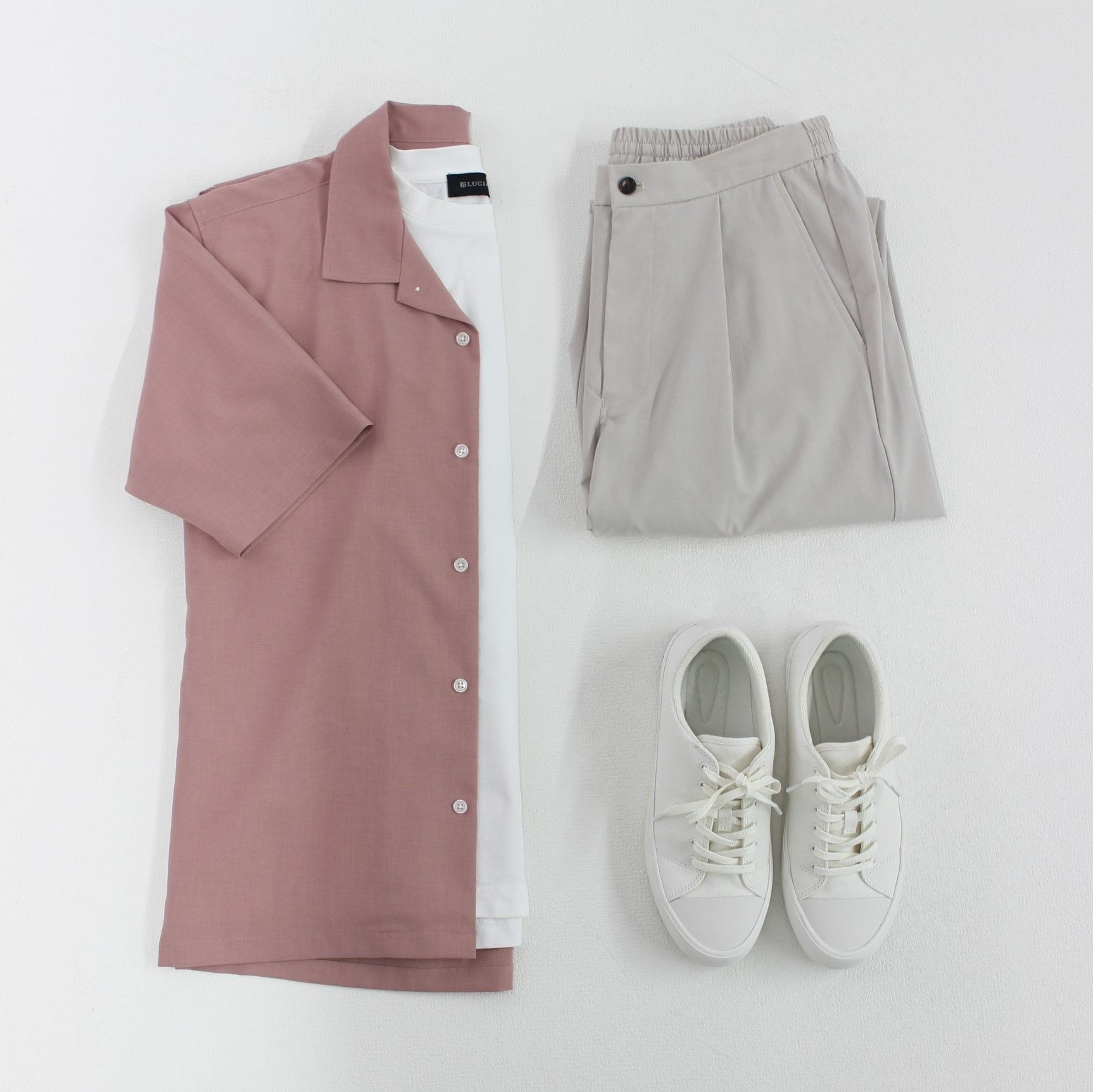 旅行にはピンクのシャツに白のTシャツを重ねたきれいめカジュアルなコーデがおすすめです。スモーキーなピンクなので、派手な印象にならず上品で優しい印象に見えます。旅行は移動の多いが予定なので、ゆとりのあるボトムスを合わせてリラックス感のあるコーデにしています。