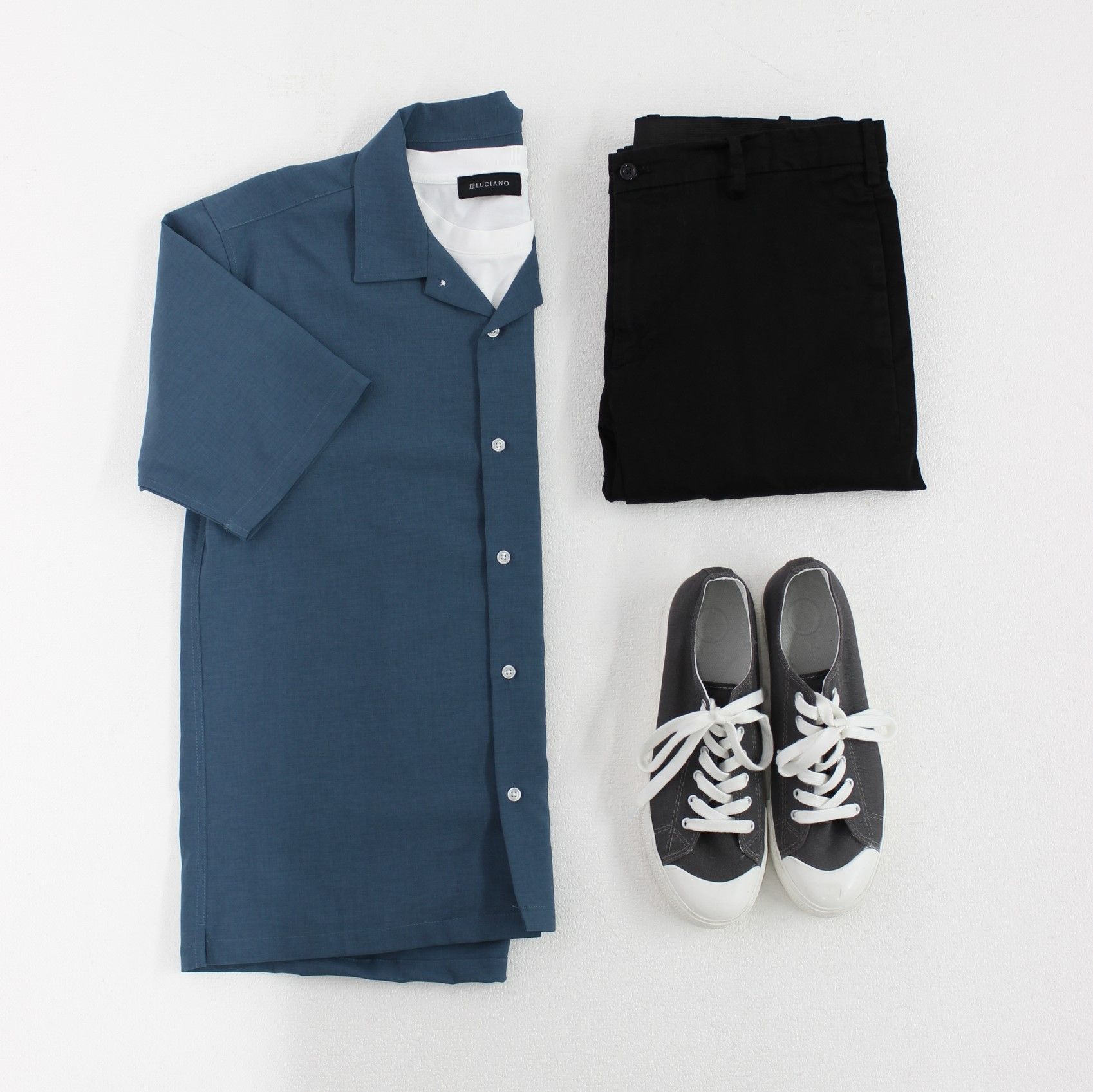 シャツに使っているブルーは、すっきりとみずみずしい風合いなので爽やかな印象に見えます。ブラックのボトムスを合わせるとコーデの色味が締まり、スタイルよく見えます。食事での場面を想定しているので、座っている時間も楽なのようにストレッチ性のあるチノパンツがおすすめです。