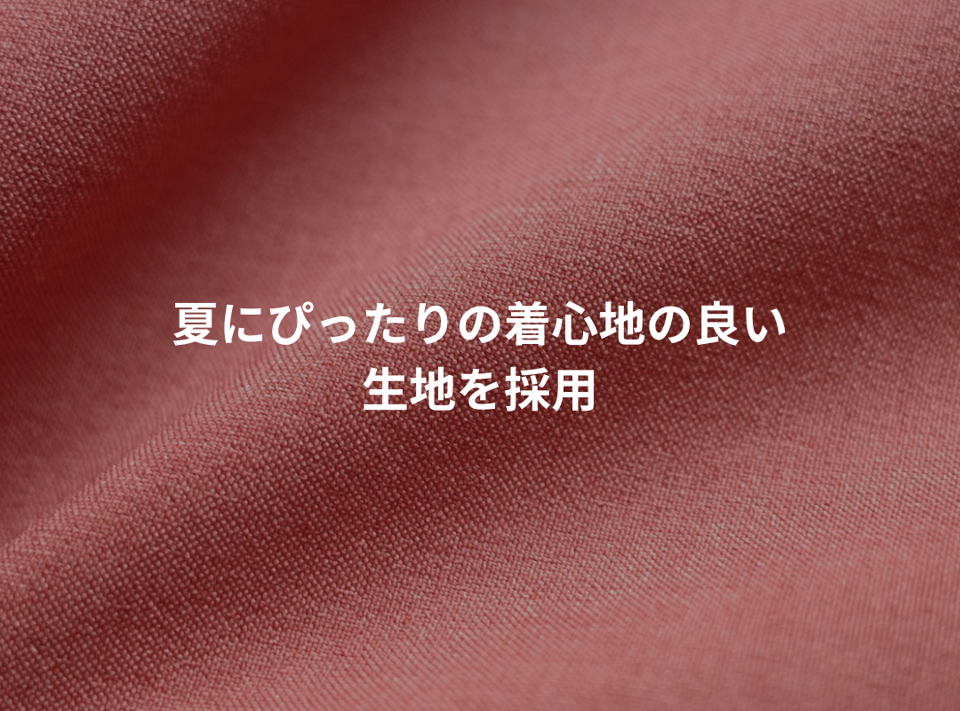 ポリエステル100%のReflax®の生地。リネンような凹凸があるので肌触りもサラッとしていて、汗をかいてもベタつかないので夏の暑い時期に使いやすいです。
