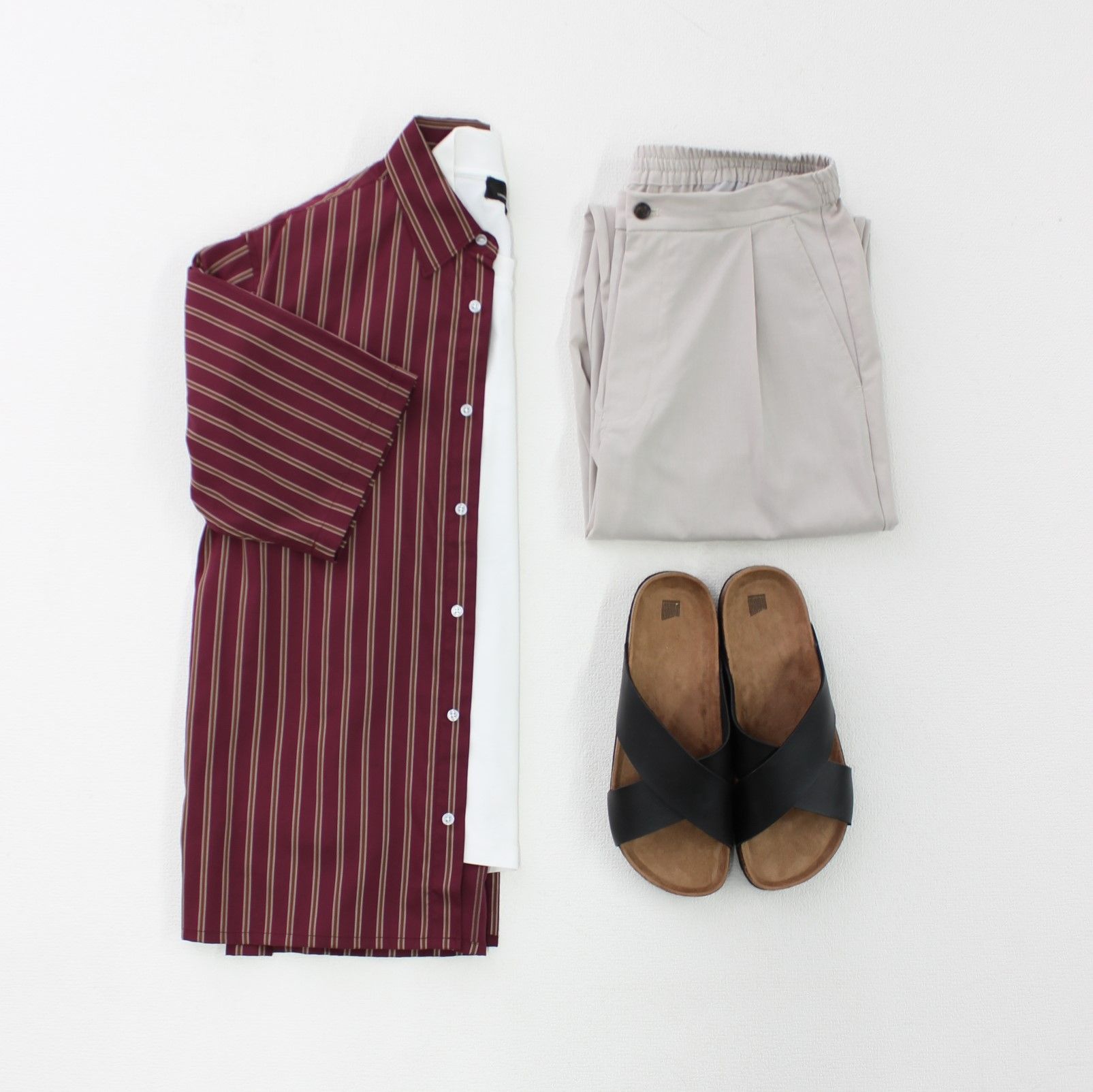 Tシャツの上から柄のシャツを羽織ったコーデにしました。柄シャツとパンツのゆったり感が少しリゾート感のあるカジュアルな着こなしです。色は暖色系を選んでいるので、明るく元気な印象にしたい人におすすめです!