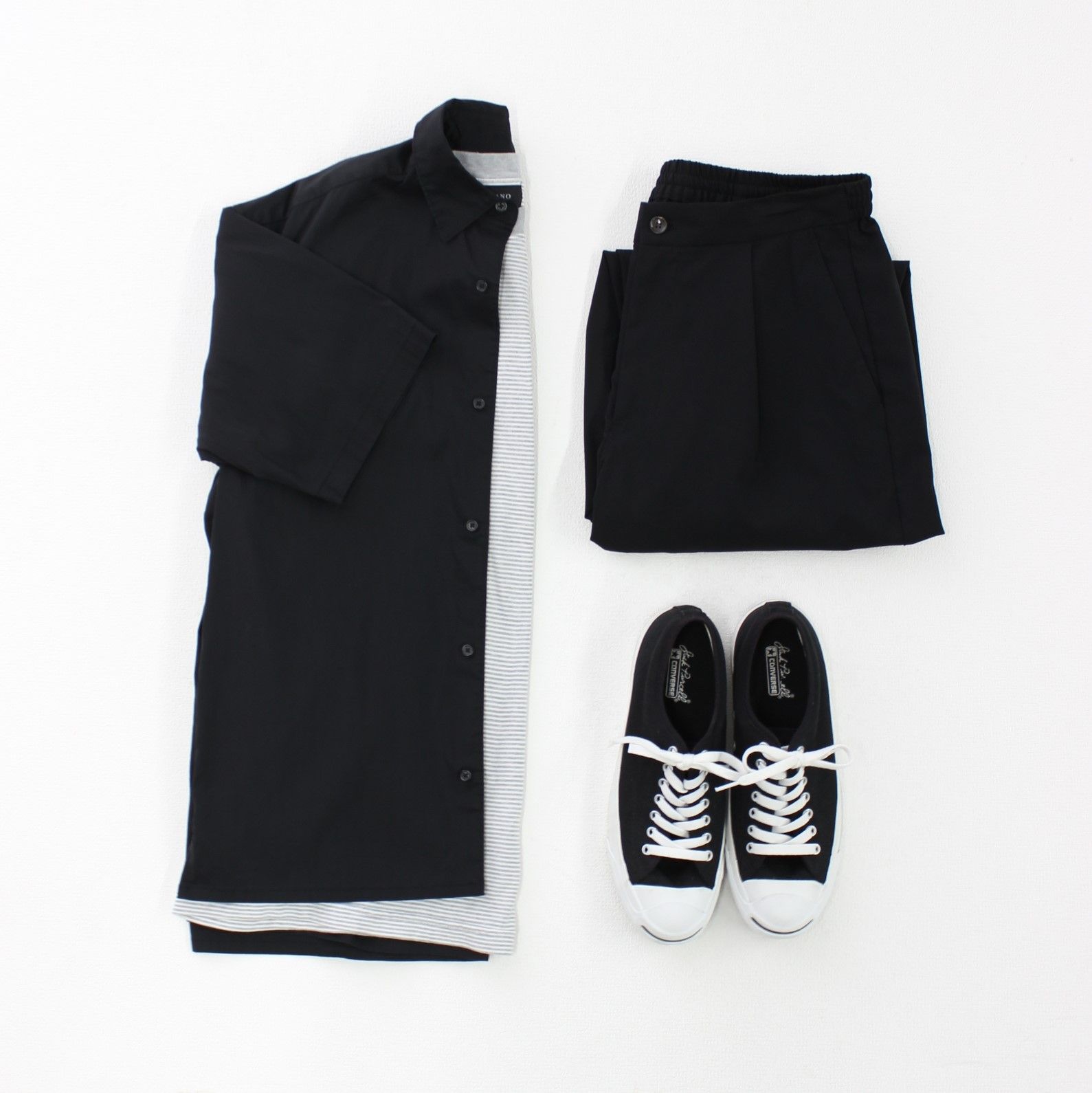 ブラックの半袖シャツとブラックのパンツを合わせてセットアップ風にした、トレンドを意識したコーデです。暗めの色でまとめているので、落ち着いた印象にしたい人におすすめです。