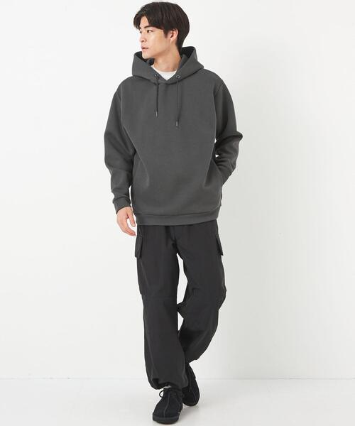 頭からすっぽり被るプルオーバータイプは、スポーティさやカジュアル感が強いのが特徴。首元や裾からインナーをチラ見せすれば、野暮ったさを抑えられます。