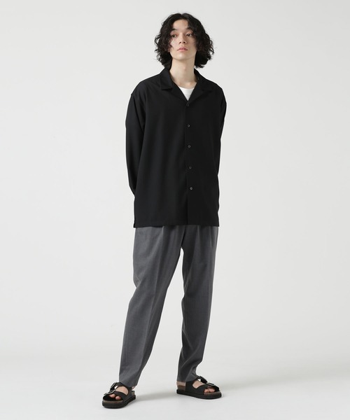 シックな大人の魅力を感じるコーデです。黒のオープンカラーのシャツは、首元が開放的なデザインでありながら、モノトーンの配色が洗練されており、シックな雰囲気を醸し出します。インナーには白Tシャツを重ね着にすることで、胸元の開きを抑えて清潔感のあるアクセントになっています。大人っぽく見せたいときや日中のカフェデートにおすすめです。